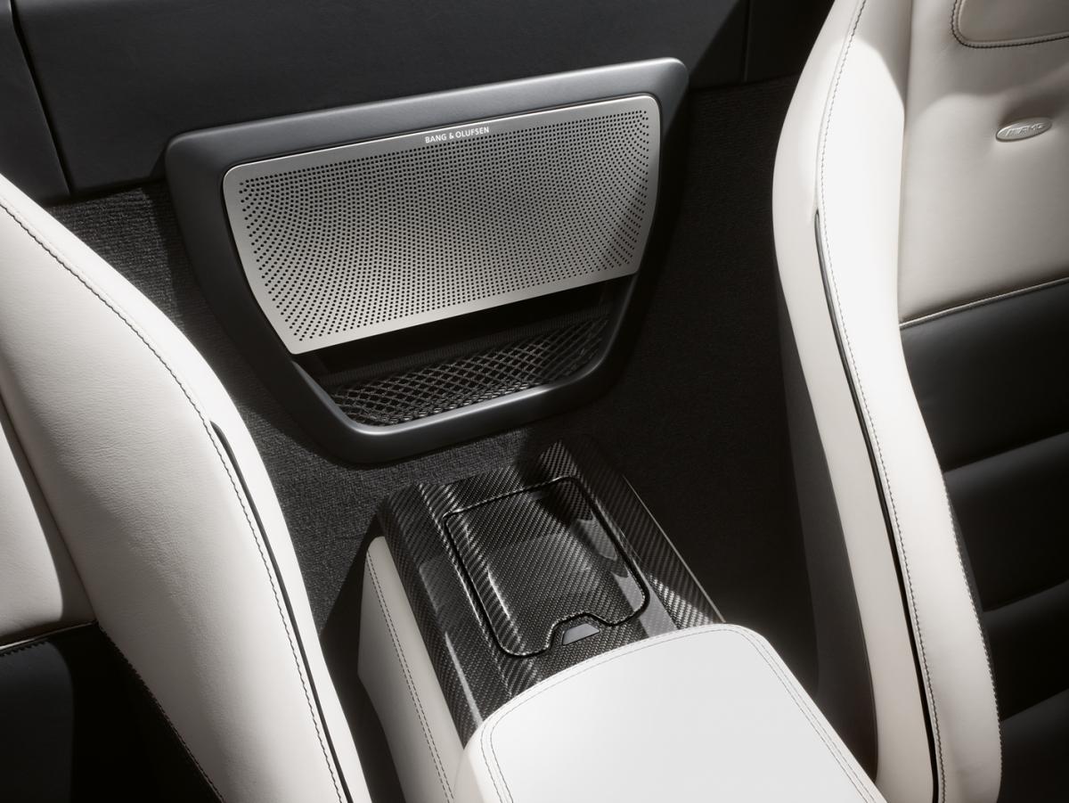 I kabinen supplerer det nye BeoSound AMG lydsystem stadig det stilrene, cockpit-inspirerede design fra forgængeren på perfekt vis. Den eneste synlige forskel er gitteret på det reviderede subwoofersystem mellem passagersæderne. Det nye, helstøbte aluminiumsgitter er en fortsættelse af det perforerede "lydbølge"-design, der breder sig som ringe i vandet fra gitterets øverste hjørner.