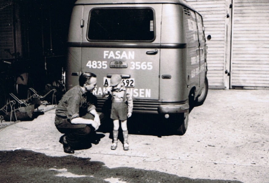 Brdr. Jensen Møbeltransport blev grundlagt i 1958 af brødrene Skjold og Frank Jensen. På billedet ses Frank Jensen med sønnen Steen i cirka 1962 ved en af virksomhedens daværende flyttebiler.