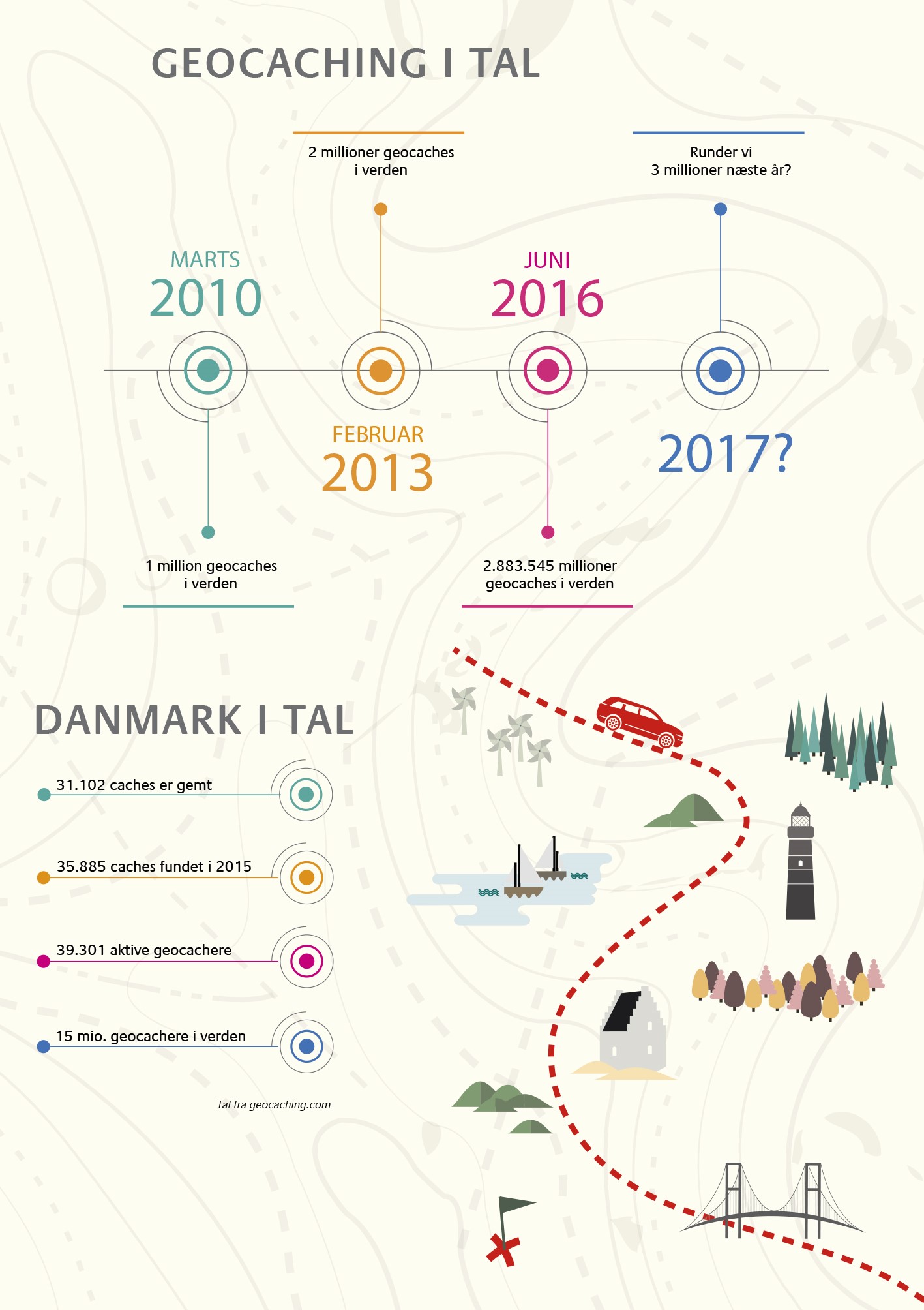 Geocaching går amok! Efteråret 2016 er der 15 millioner aktive geocachere over hele verden på jagt efter knap 3 millioner skjulte skatte. I Danmark er omkring 40.000 skattejægere registreret, og der ligger 31.000 skatte skjult rundt om i det danske land. Turistforeninger, campingpladser og virksomheder har set ideen og udnytter jagtens fascination i deres markedsføring. Hop med på trenden.