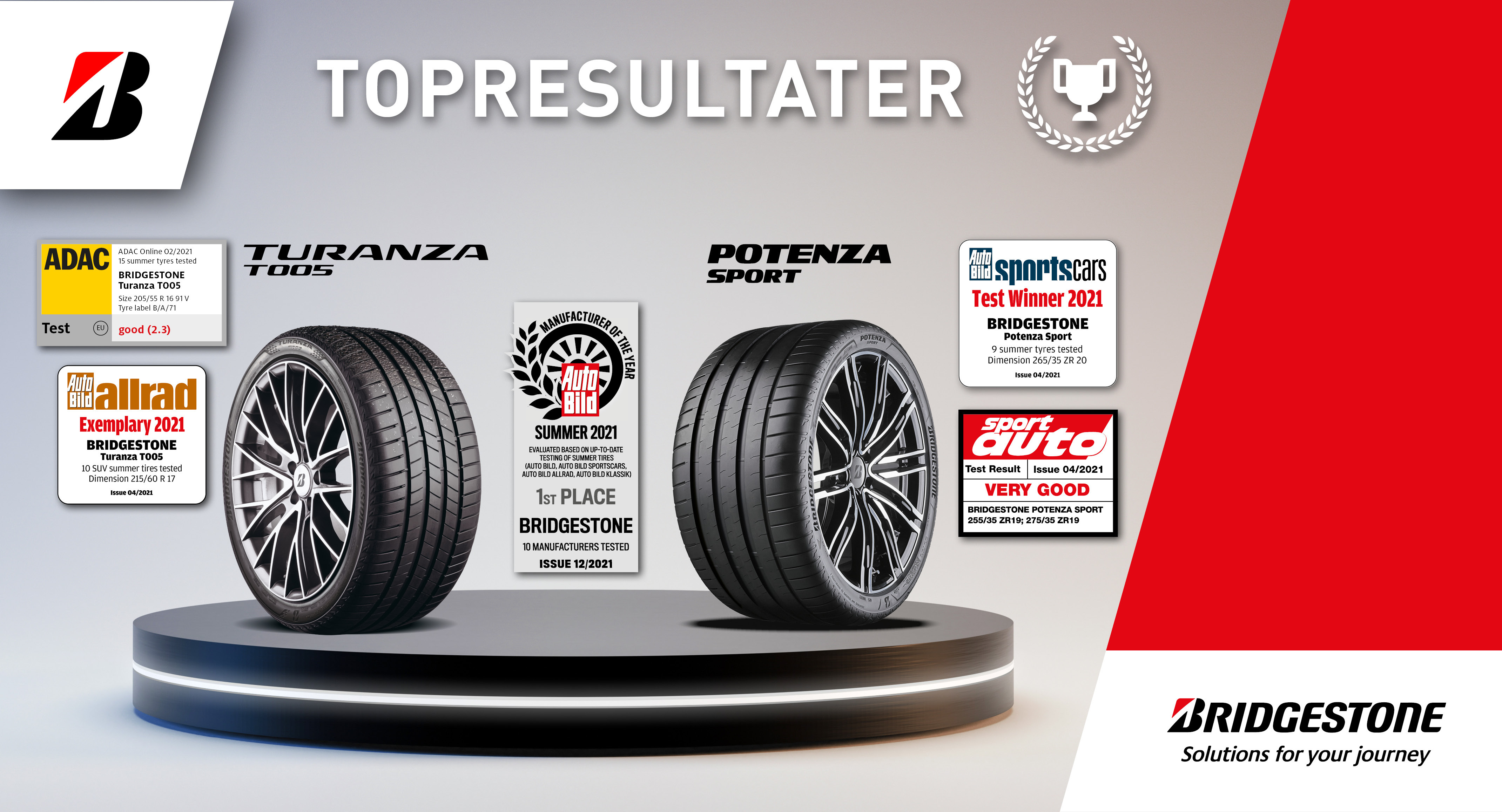 AutoBild kårer Bridgestone som Årets Producent af sommerdæk efter en lang række topplaceringer i europæiske dæktests. Bridgestone trækker fra konkurrenterne med sit nye, højtydende sportsdæk Potenza Sport og touringdækket Turanza T005. Begge dæk har igen og igen indtaget topplaceringer.