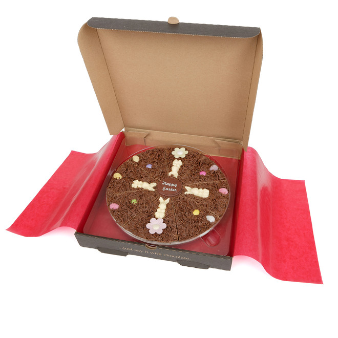 Man kunne også skifte det traditionelle chokoladepåskeæg ud med en påskechokoladepizza! Lys belgisk chokolade med honningkugler, chokoladeæg og chokoladekrymmel formet som en pizza og skåret ud i slices - lige til at hapse!
