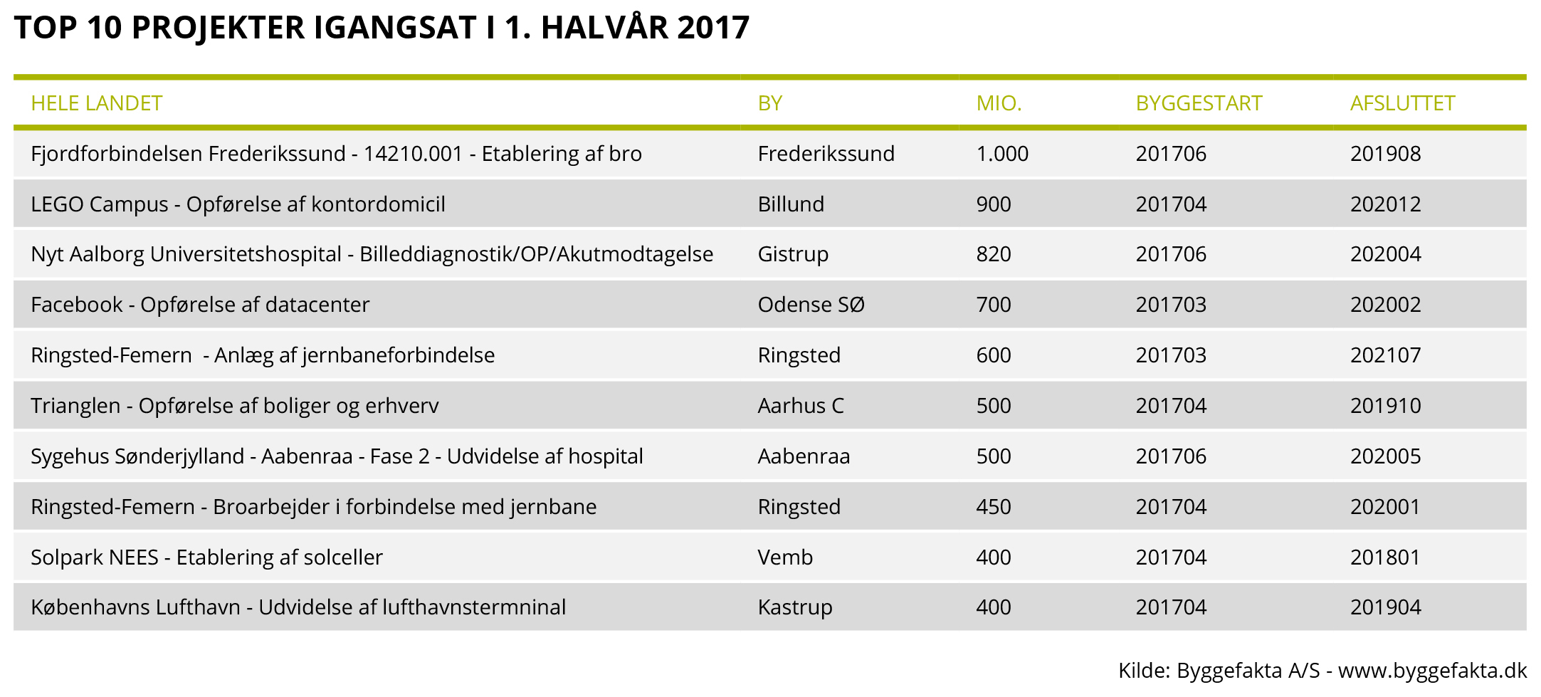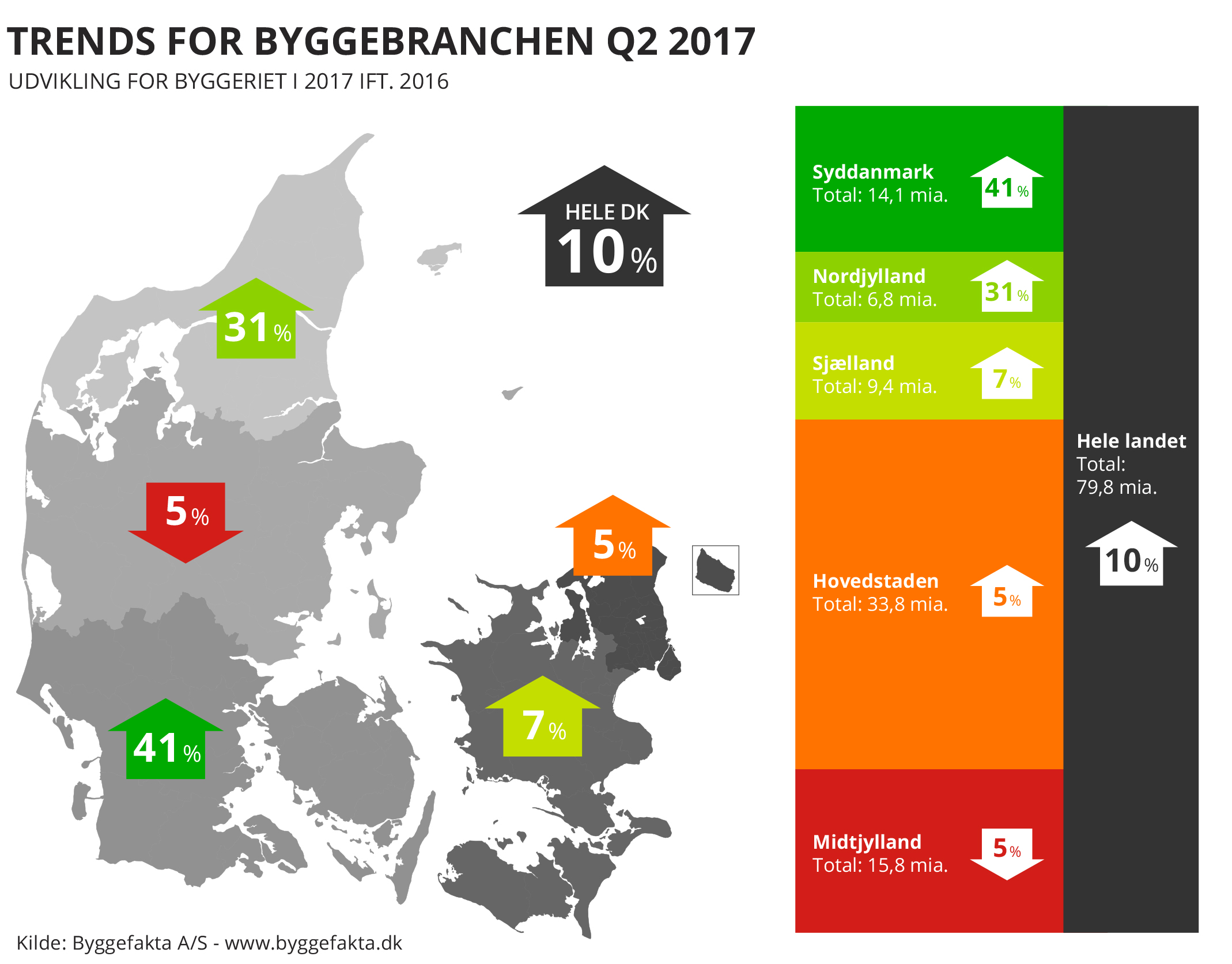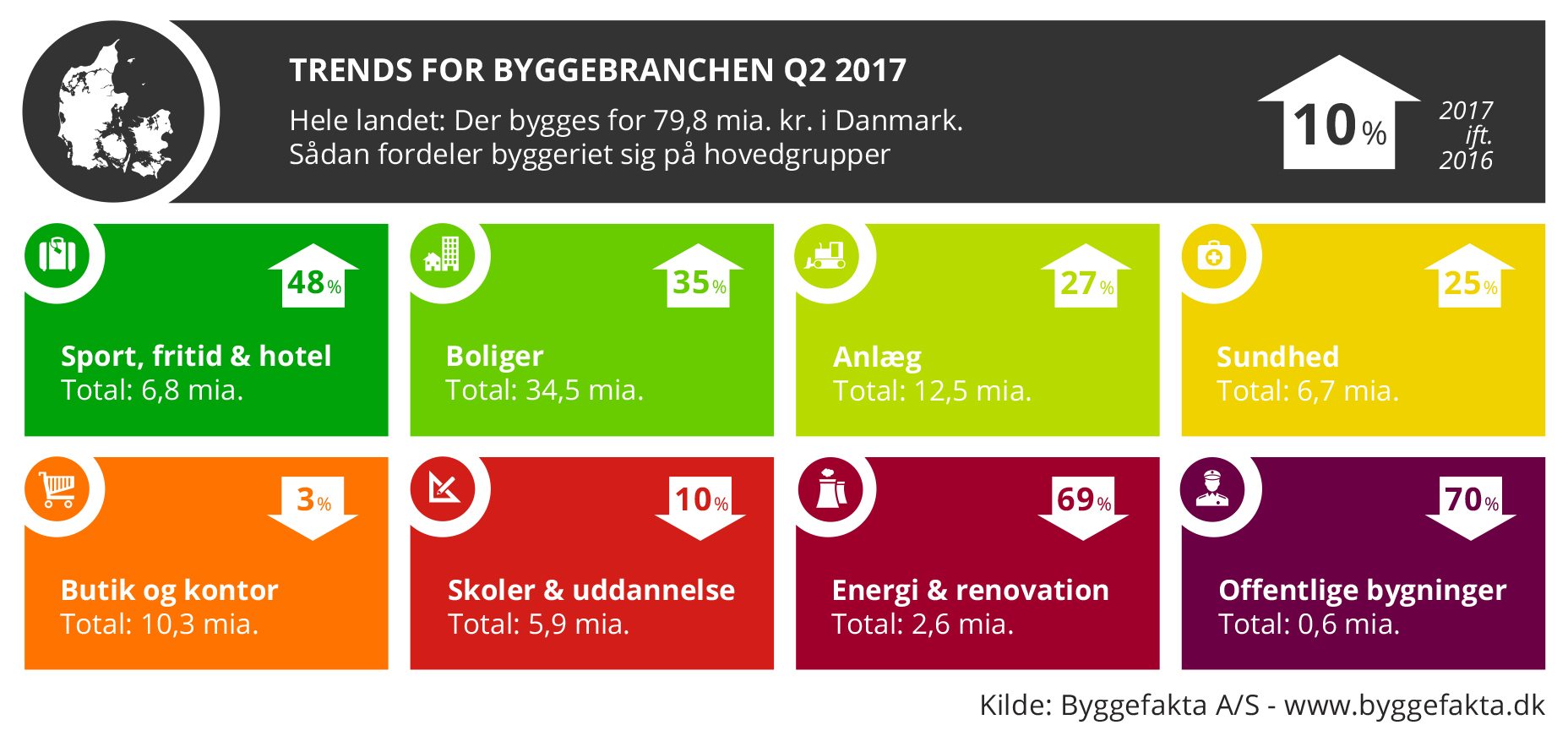 De positive takter i årets første kvartal, har vist sig at fortsætte i andet kvartal. Ifølge den nye prognose forventes det nu, at der igangsættes projekter for 79,8 mia. kr. i Danmark i 2017, hvilket er en fremgang på 7,1 mia. kr. i forhold til 2016.