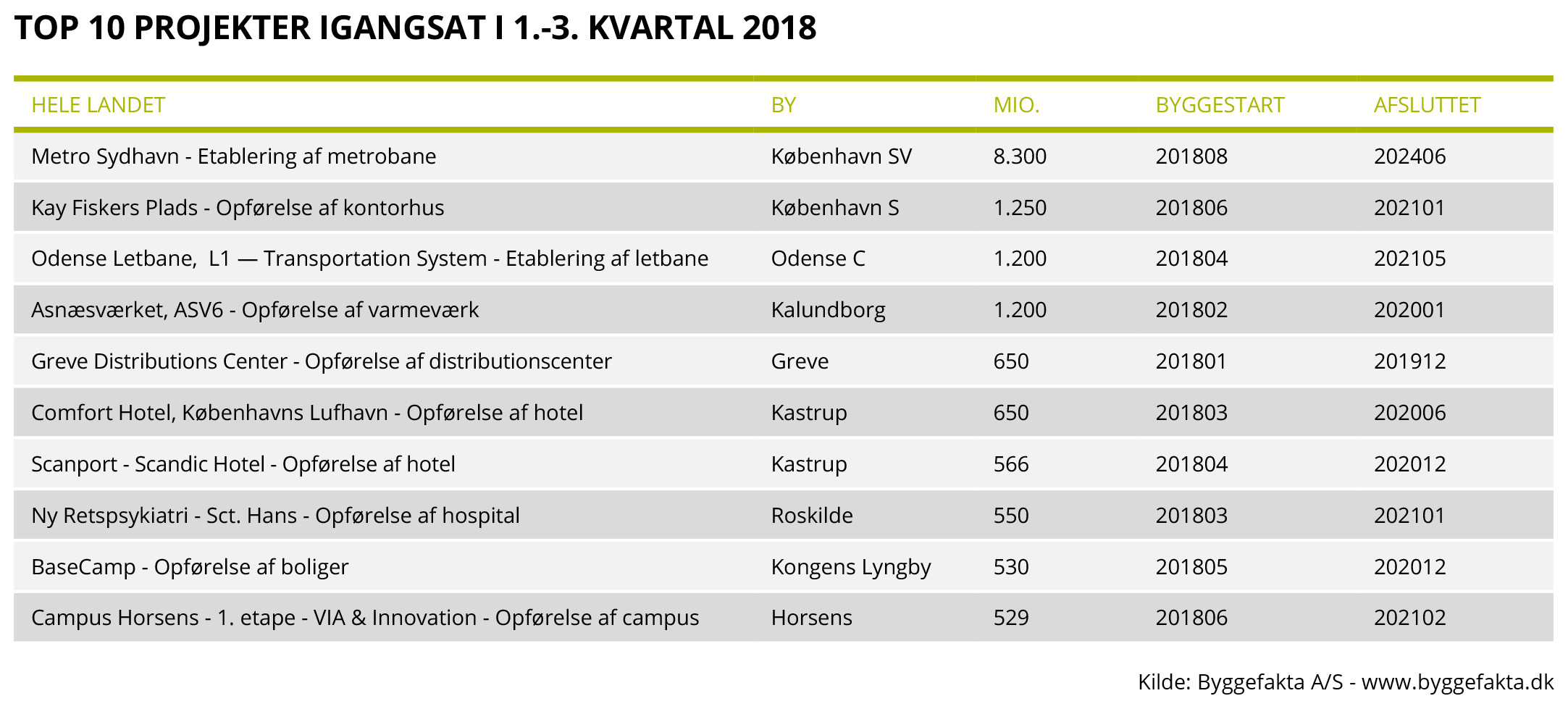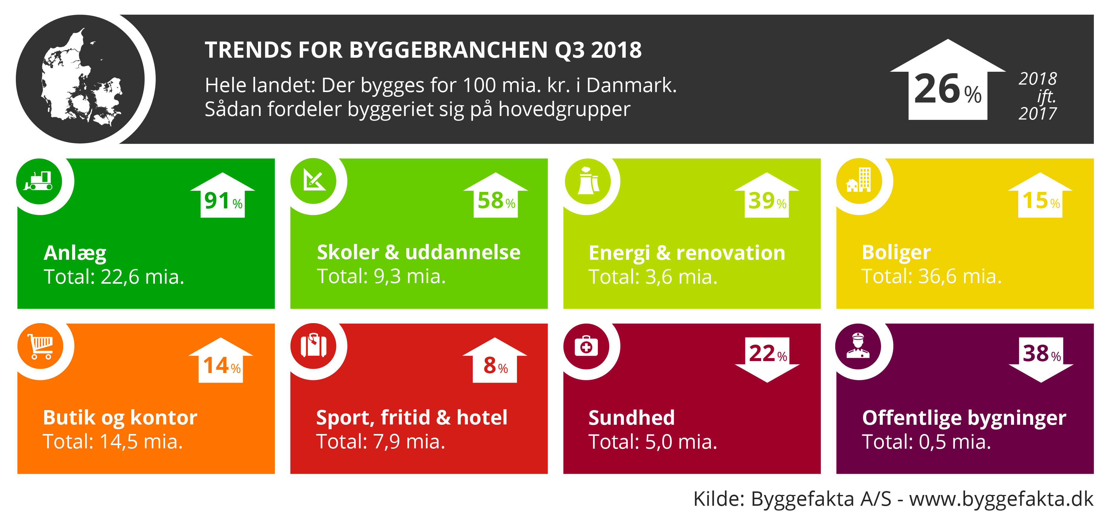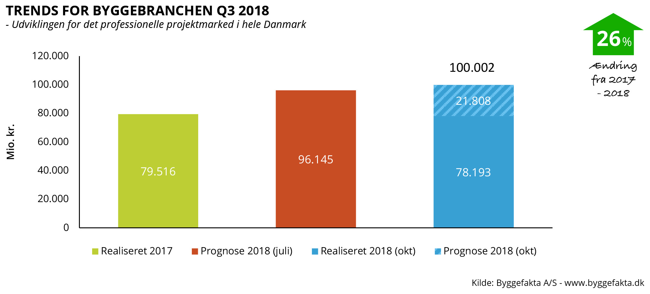 Byggeriet har udviklet sig mere positivt end forventet i 3. kvartal, det viser helt nye tal fra Byggefakta A/S. Ifølge den nye prognose forventes det nu, at der bliver igangsat byggeprojekter for 100 mia. kr. i Danmark i 2018. Det svarer til en fremgang på hele 26 pct. i forhold til niveauet i 2017. I reelle tal er der tale om byggeprojekter for 20,5 mia. kr. mere end i 2017.