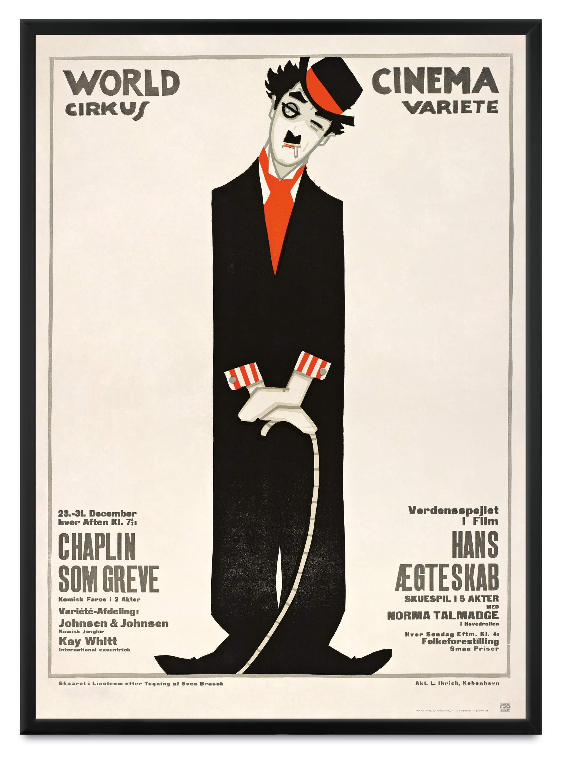 Den enkle og internationalt anerkendte filmplakat Chaplin som Greve kan findes som genoptryk på www.danskplakatkunst.dk