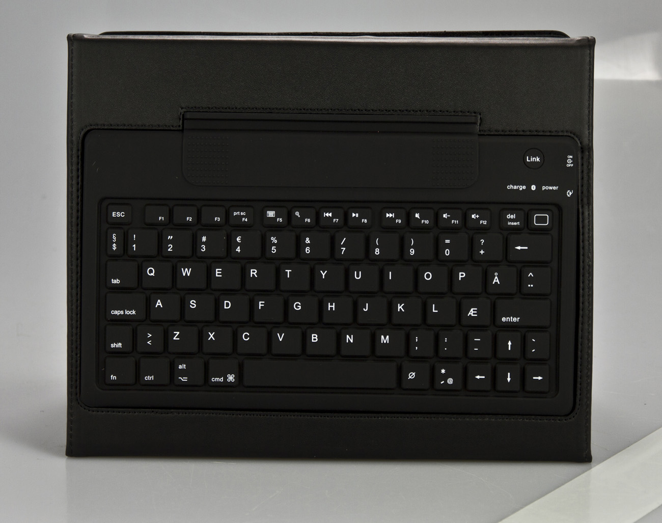 For at kunne benytte kombinationen af tastatur og tablet bedst muligt, er der selvfølgelig også en støttefunktion på bagsiden af fodralet. Dette gør, at når det klappes ud, ligger tastaturet fladt som ved enhver anden bærbar eller stationær computer, og selve iPad'en står oprejst, som en almindelig computerskærm. På den måde vil den være mere behagelig at skrive på.