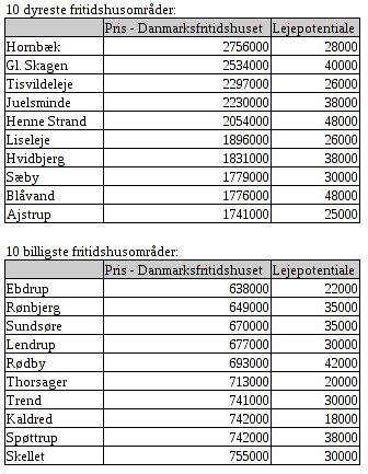 Det dyreste Danmarksfritidshus ligger i Hornbæk og koster 2.756.000 kr. Næstdyrest er Gl. Skagen med 2.534.000 kr. Danmarks billigste fritidshusområder er Ebdrup på Djursland og Rønbjerg ved Limfjorden, hvor fritidshuset kan fås for henholdsvis 638.000 kr. og 649.000 kr.