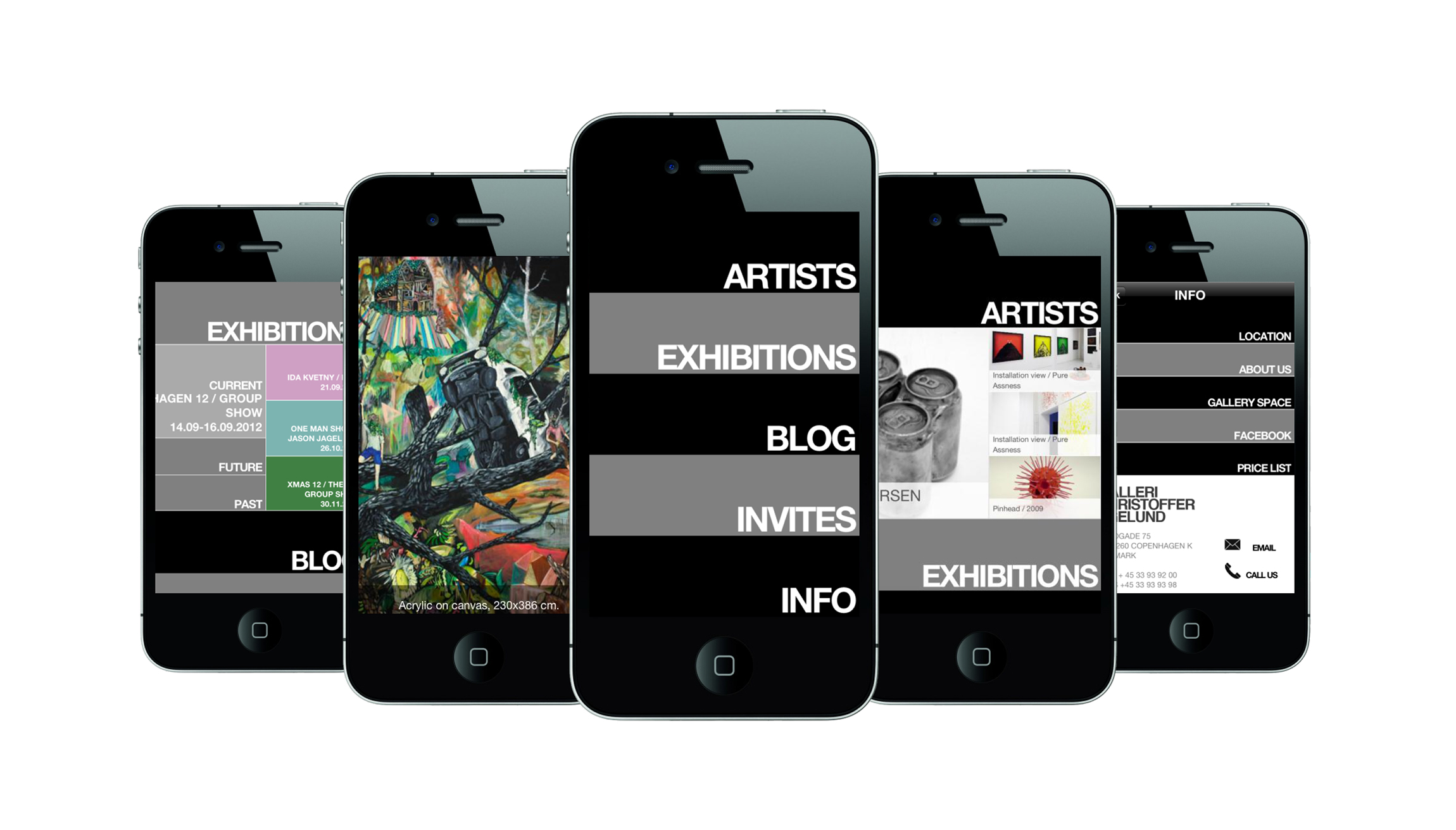 Den nye App har rigtig mange spændende features og menuen indeholder: ARTISTS, EXHIBITIONS, BLOG, INVITES og INFO.