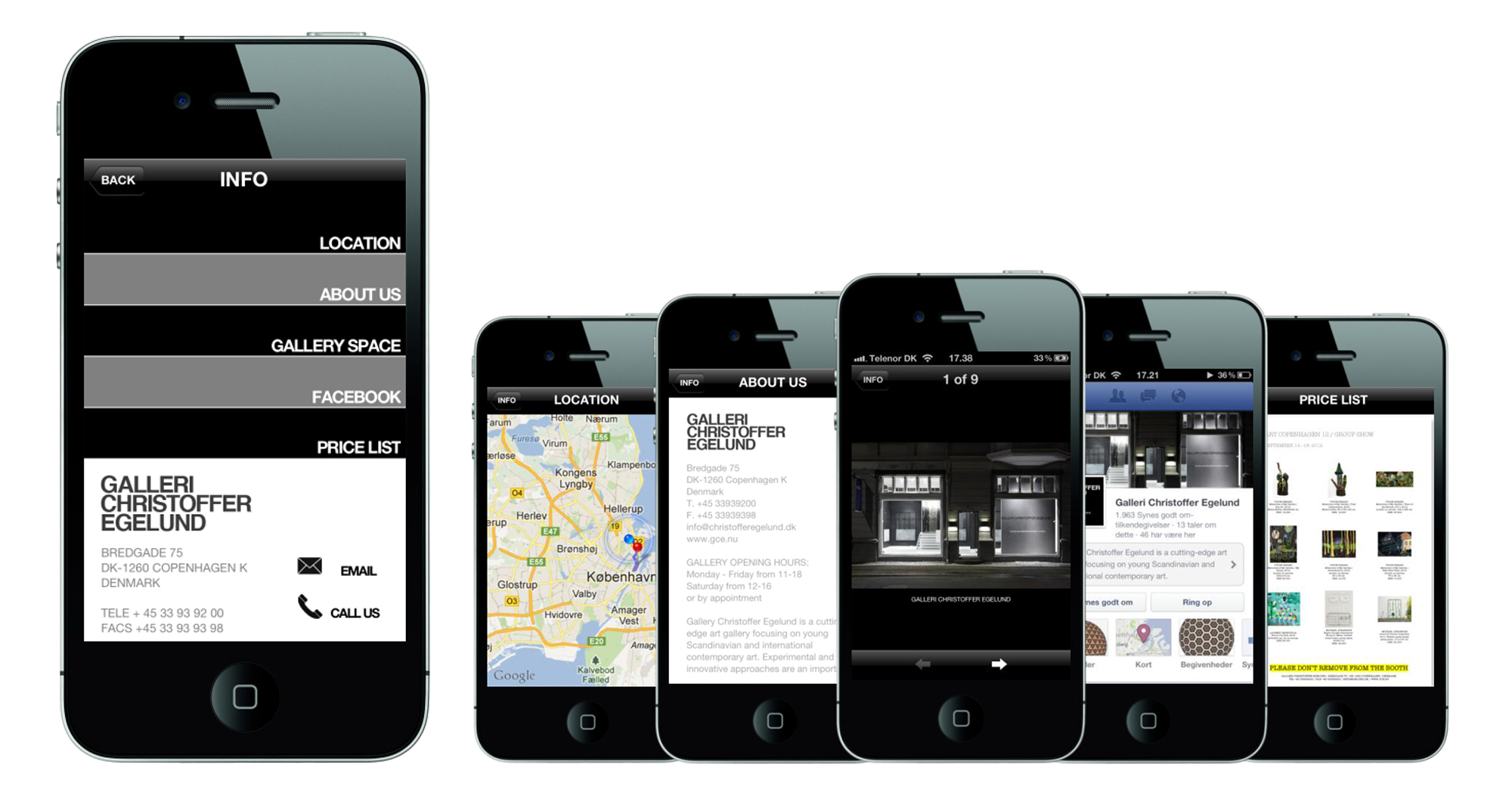 INFO-delen indeholder alle praktiske informationer og oversigter. Her findes en præsentation af galleriets lokaler og fra App'en kan man ringe og skrive til galleriet. Ligeledes kan man få direkte adgang til galleriets Facebook-profil, hvor man kan skrive kommentarer og tilkendegive "˜likes'.