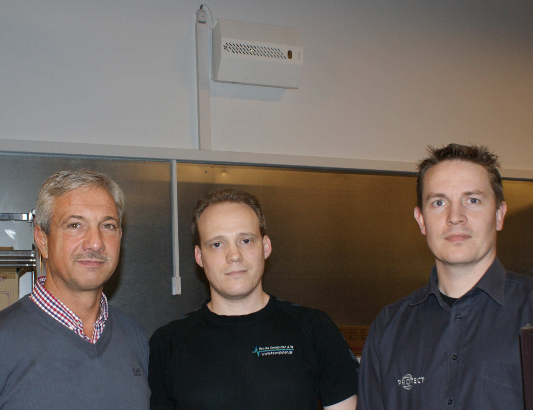 Billedtekst: Jan Svendsen, ABS Alarm & Sikkerhed (tv), Brian Hansen, Føniks Computer, og Martin Skaar Jacobsen, Protect inde på lageret, hvor en af tågekanonerne samt bevægelsessensorerne ses i baggrunden.