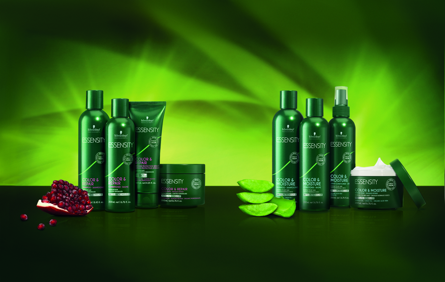 100% hvidhaÌŠrsdækning, 30% mere glans og 50% længere holdbarhed. Farverne indeholder bla. plantebaserede olier og erstatter syntetiske ingredienser med vedvarende, naturligt udvundne ingredienser, og giver samtidig en fantastisk og naturlig farveintensitet. Ny ESSENSITY Colour Care sortiment aÌŠbner en ny generation af farve-pleje uden brug af sulfater, siliconer, parabener og mineralsk olie. HaÌŠrplejeserierne, Color & Repair samt Color & Moisture, giver maksimal beskyttelse mod at farven falmer, genopbygger haÌŠret og giver mere glans.
