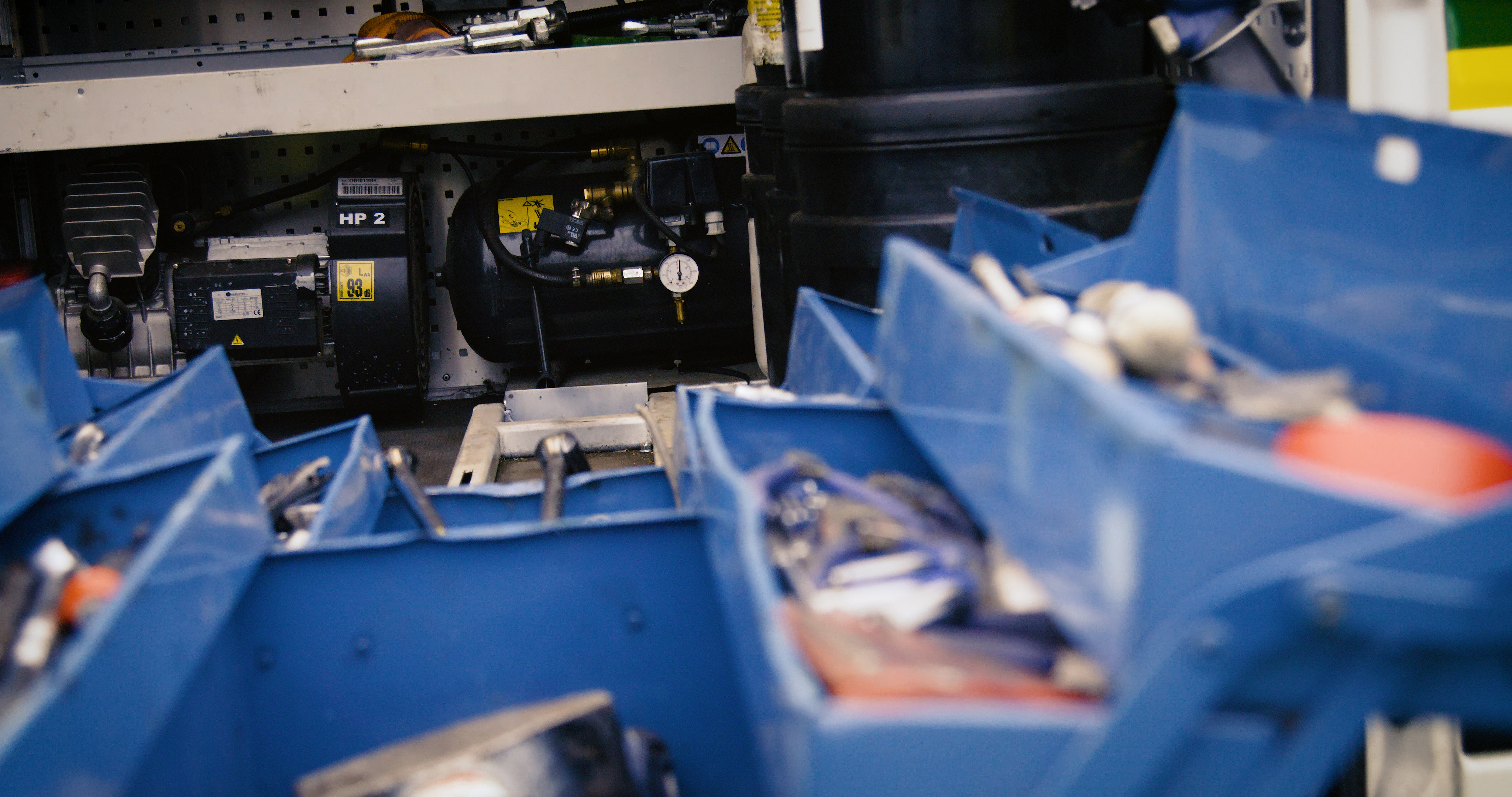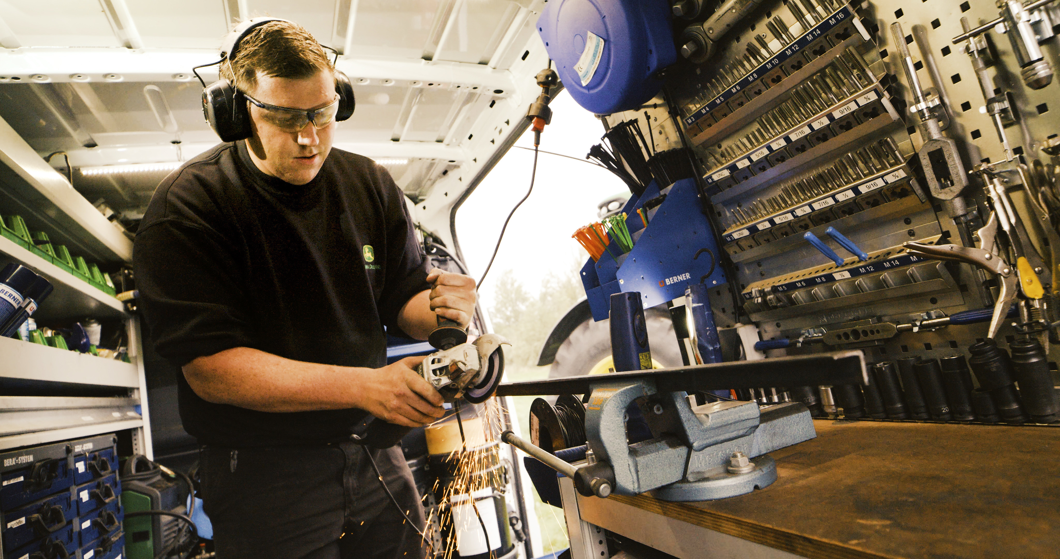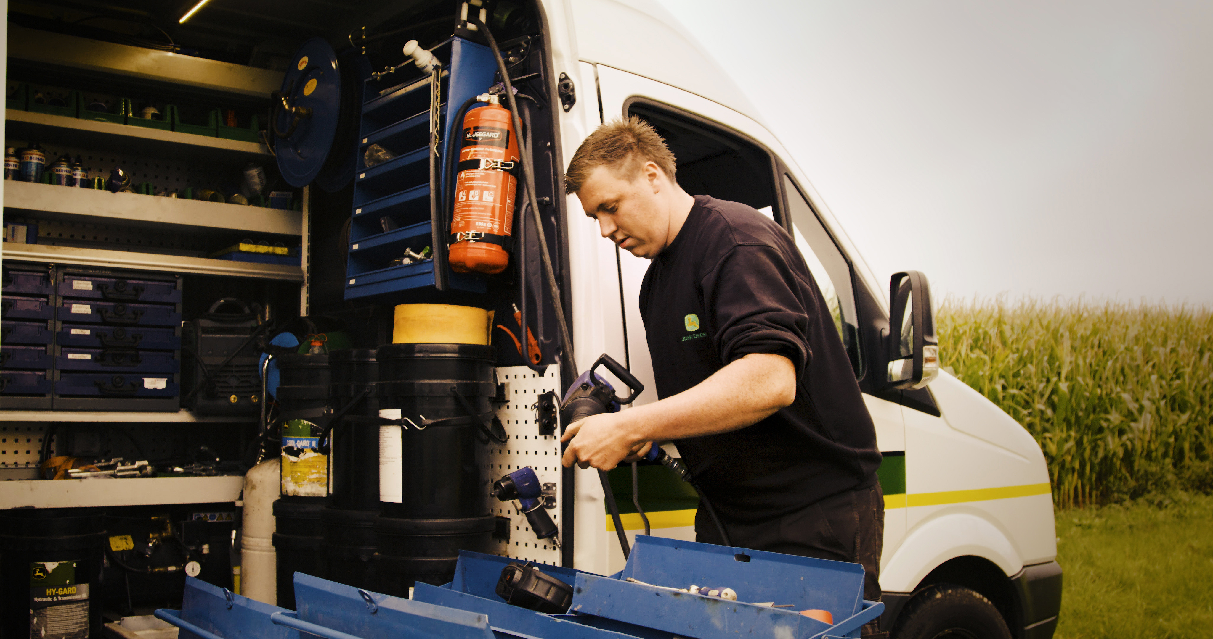 Strøm i varebilen skal være kompakt og driftssikkert. John Deere's 54 servicebiler i Danmark er opbygget som et komplet værksted fortæller Jonas Larsen som er kørende serviceteknikker og fortsætter: I varebilerne er der behov for, at kunne bruge både 230V og 12V til batteriladere, kompressor, svejser og arbejdslys for at kunne løse alle opgaver i marken.