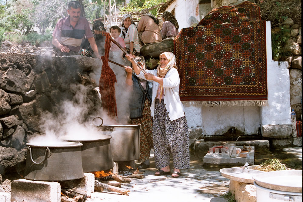 Til en kvadratmeter Dobag-tæppe går der uld fra 10 får, den tykke vinteruld vel at mærke. Ulden vaskes, kartes og spindes i hånden, før den er klar til farvningen, som foregår i store gryder over åben ild.
