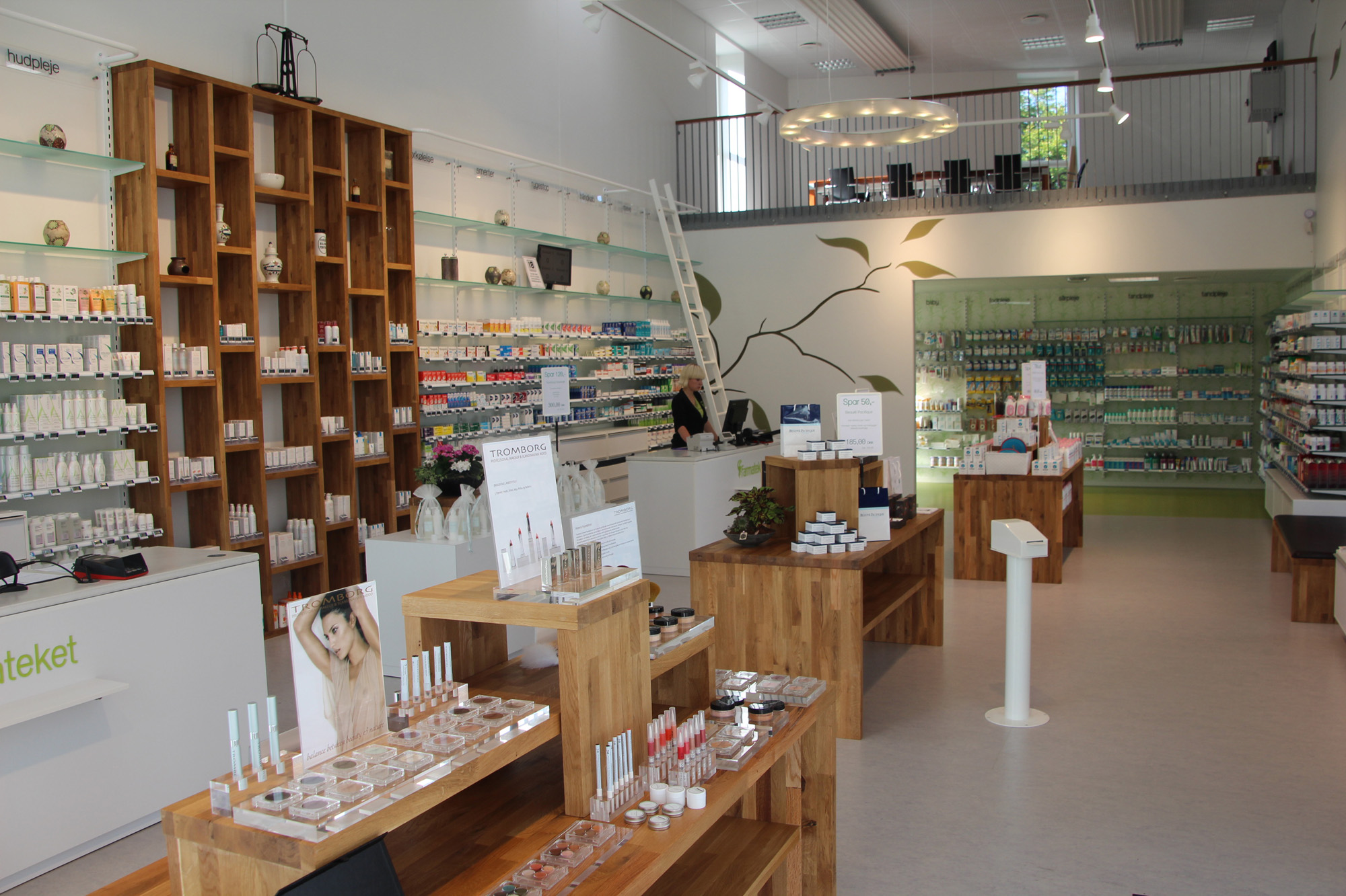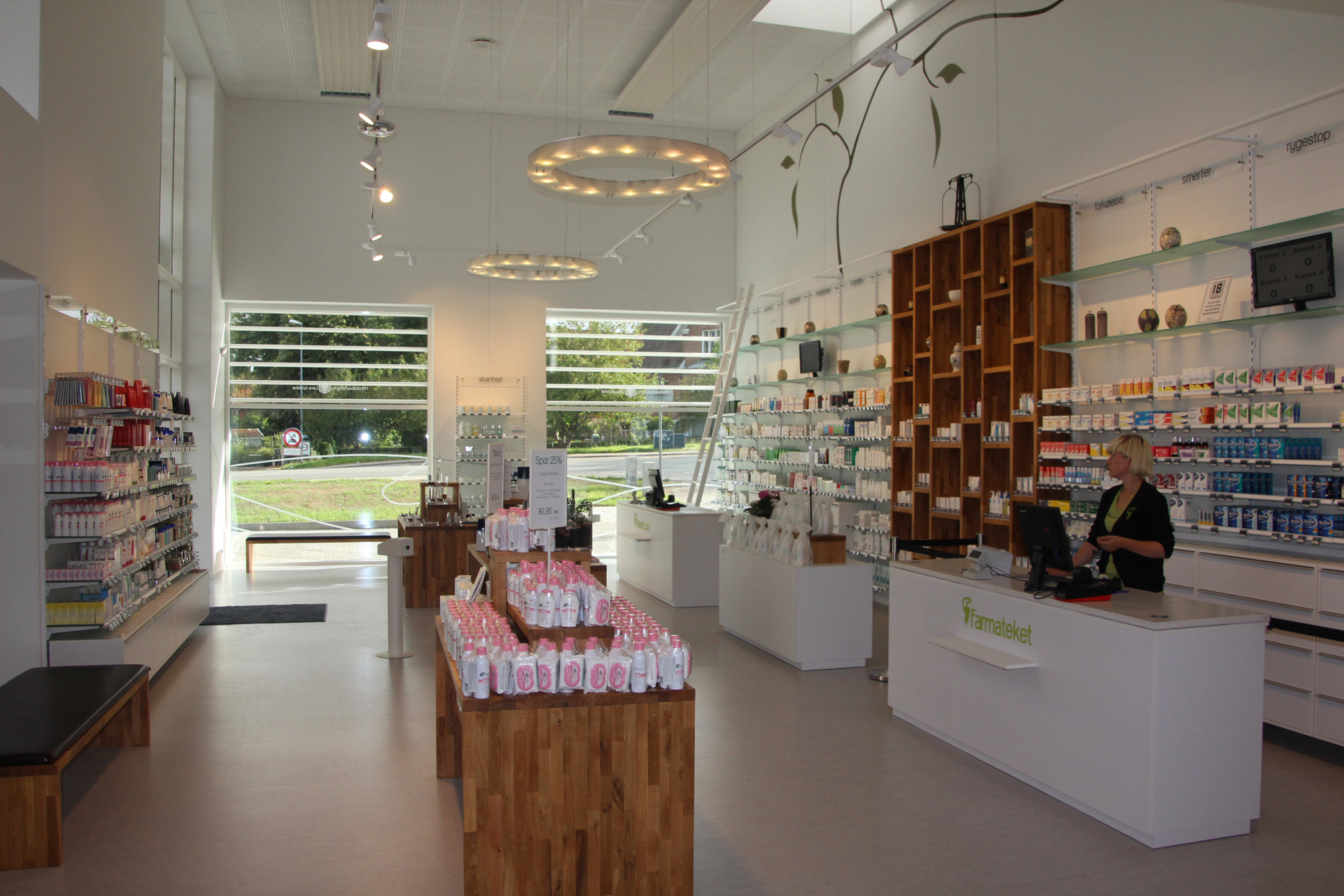 I loftet har Lysdesigneren Naija Nygaard fået lov til at sætte sig præg med 2 cirkelrunde lamper, som er specialformede til rummet og derved helt bevidst udgør en kontrast til Farmatekets firkantede lokale. Lamperne, som er udfærdiget i plexiglas, og med synlige, rå skruer, kaster et klosteragtigt lys ud i rummet, og er på den måde med til at underbygge Farmatekets udtryk. Bagerst i butikken er der indrettet en lille "Klosterhave" til børnene, så kunderne stille og roligt kan handle og få grundig produktvejledning af personalet, imens at deres børn leger og er underholdt på anden vis.