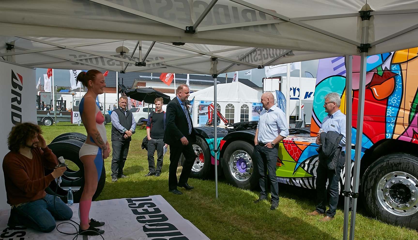 På Bridgestones stand tog den amerikanske kunstner Ray Hill opstilling ved siden af en farverig lastbil, som det har taget ham to måneder at dekorere i fri hånd og uden nogen form for skitse. Efter nogen overvejelse takkede maleren ja til en utraditionel udfordring fra dækfirmaets salgs- og marketingchef - nemlig at spraymale samme motiv på modellen Lærke. Kun iført trusser lagde hun velvilligt krop til eksperimentet både fredag og lørdag, og begge gange blev resultatet fint.