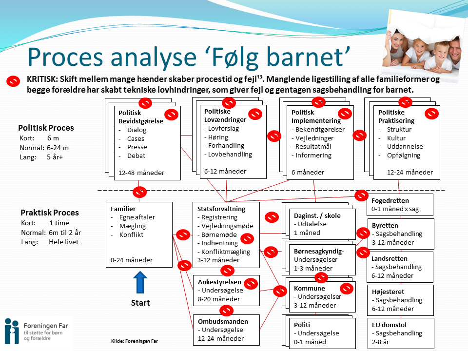 FOKUS 2: DEN OFFENTLIGE SAGSBEHANDLINGDet andet fokusområde handler om menneskerettighederne i den offentlige sagsbehandling på familie-, børne- og socialområdet. Det er forholdsvis nemt at analysere de offentlige sager baseret på 5 faktorer, som kan bruges ledelsesmæssigt i alle menneskelige processer (tid, kvalitet, ligestilling, fleksibilitet og omkostninger). Foreningen Far oplever ved simple analyser, at der sker fejl og forskelsbehandling i stort set samtlige offentlige sager og til tider er optil 10 offentlige enheder og 50 mennesker inden over et sagsforløb. Offentlige fejl findes, indrømmes og rettes simpelthen for sjældent og familier samt børn bliver pga. forældet lovgivning og praksis, til tider sendt rundt i det offentlige system i årevis og havner i sorte huller. Alle gode ledere ved at skift af hænder i menneskelige processer skaber procestid, tab af viden og fejl - og det er præcist hvad der sker i familie-, børne- og socialsagerne i Danmark. Det kan håndteres med god offentlig ledelse og moderne lovgivning i trit med samfundsudviklingen langt hen ad vejen, så kun ganske få sager står tilbage.