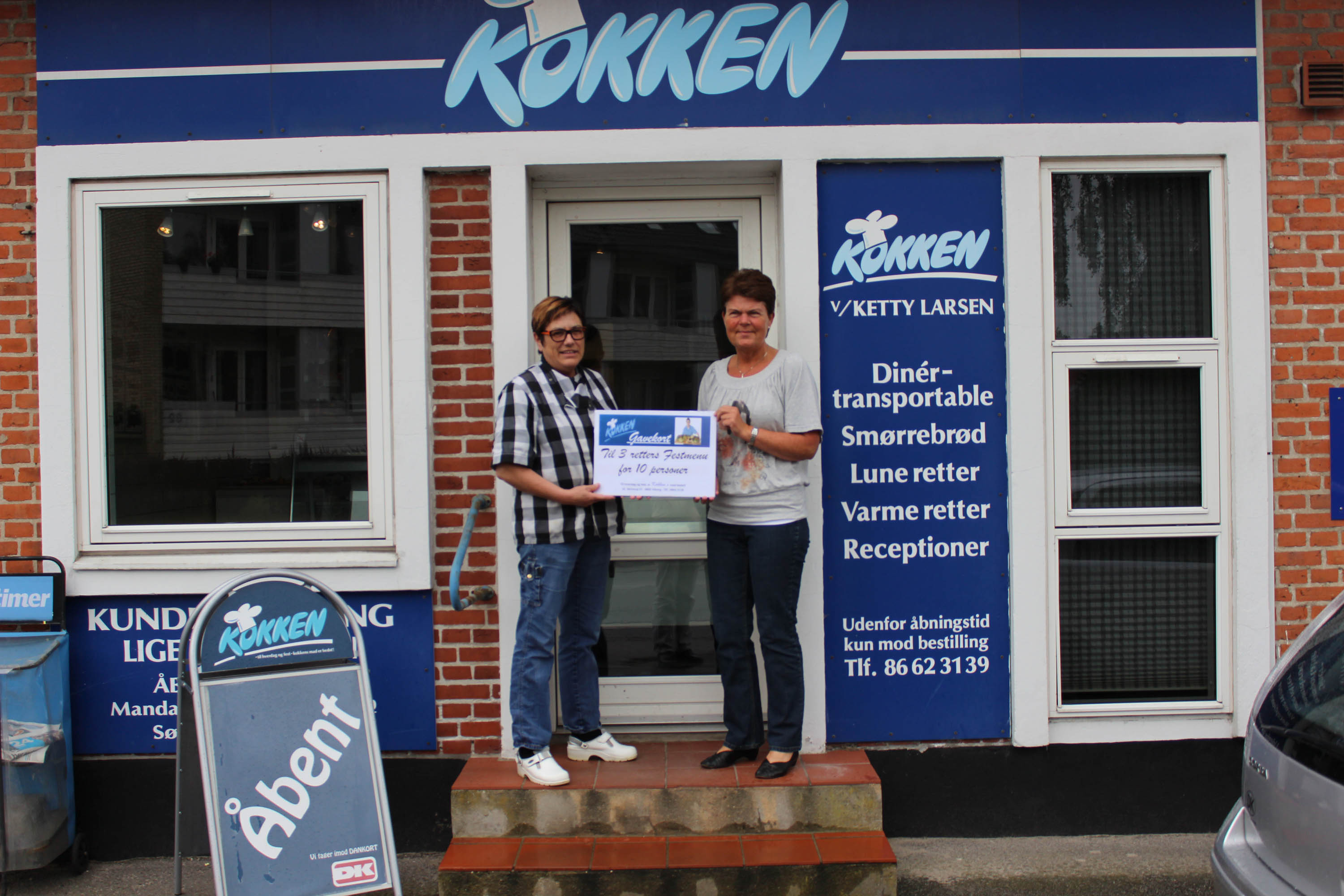 Billedtekst:Mere end 100 kunder har deltaget i en spørgeskemaundersøgelse omkring deres vaner med takeaway-mad. Blandt svarene er der trukket lod om en festmiddag for 10 personer, og vinderen blev Helle Nielsen (th), der her får overrakt gavekortet af Ketty Larsen.