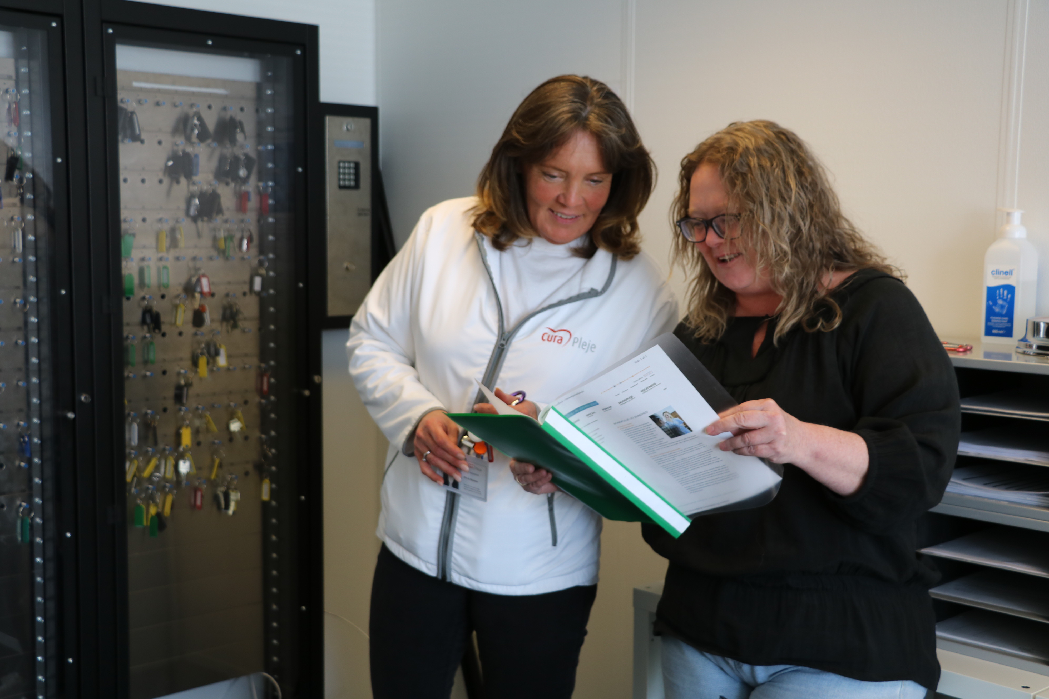 | Tekst: | Borgerne er blevet mere syge og fysisk tungere. Men samtidig har vi jo fået flere hjælpemidler, der kan assistere os i arbejdet. Det er vigtigt for et godt arbejdsmiljø, fortæller Pia Nielsen (tv), som her sammen med driftsleder Ruth Tagesen (th) forbereder dagens indsatser ved borgerne. |