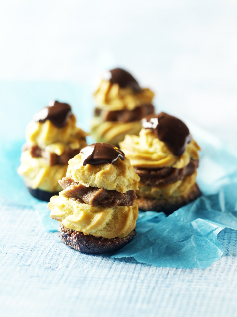 Pisk nougatcremen luftig. Skær en lomme i hver bakkelse og fyld dem med nougatcreme.