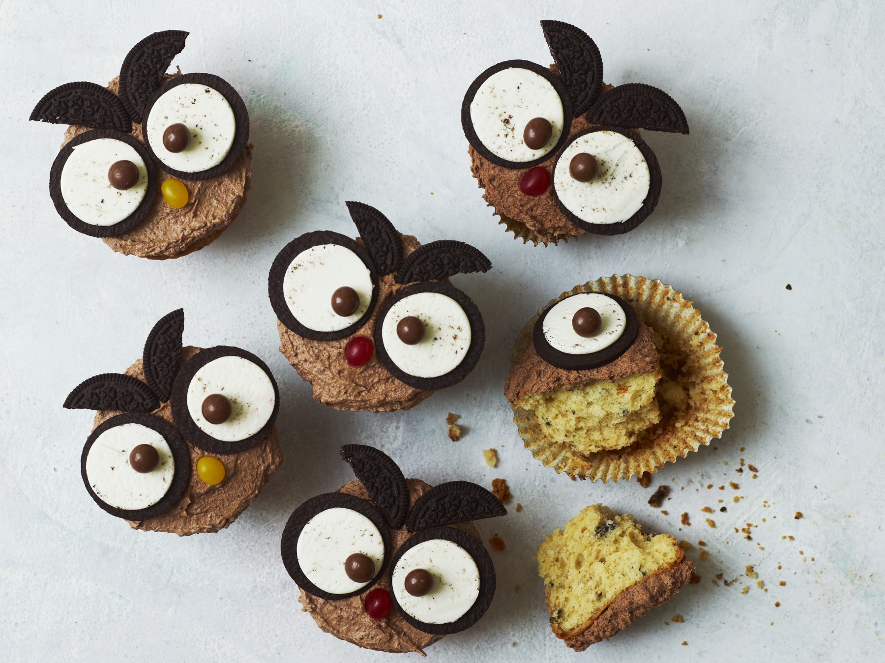 hver kage som store øjne og marker øjnene med små chokoladeknapper. Lav næb med bønnerne og øre med Oreo overdelen.