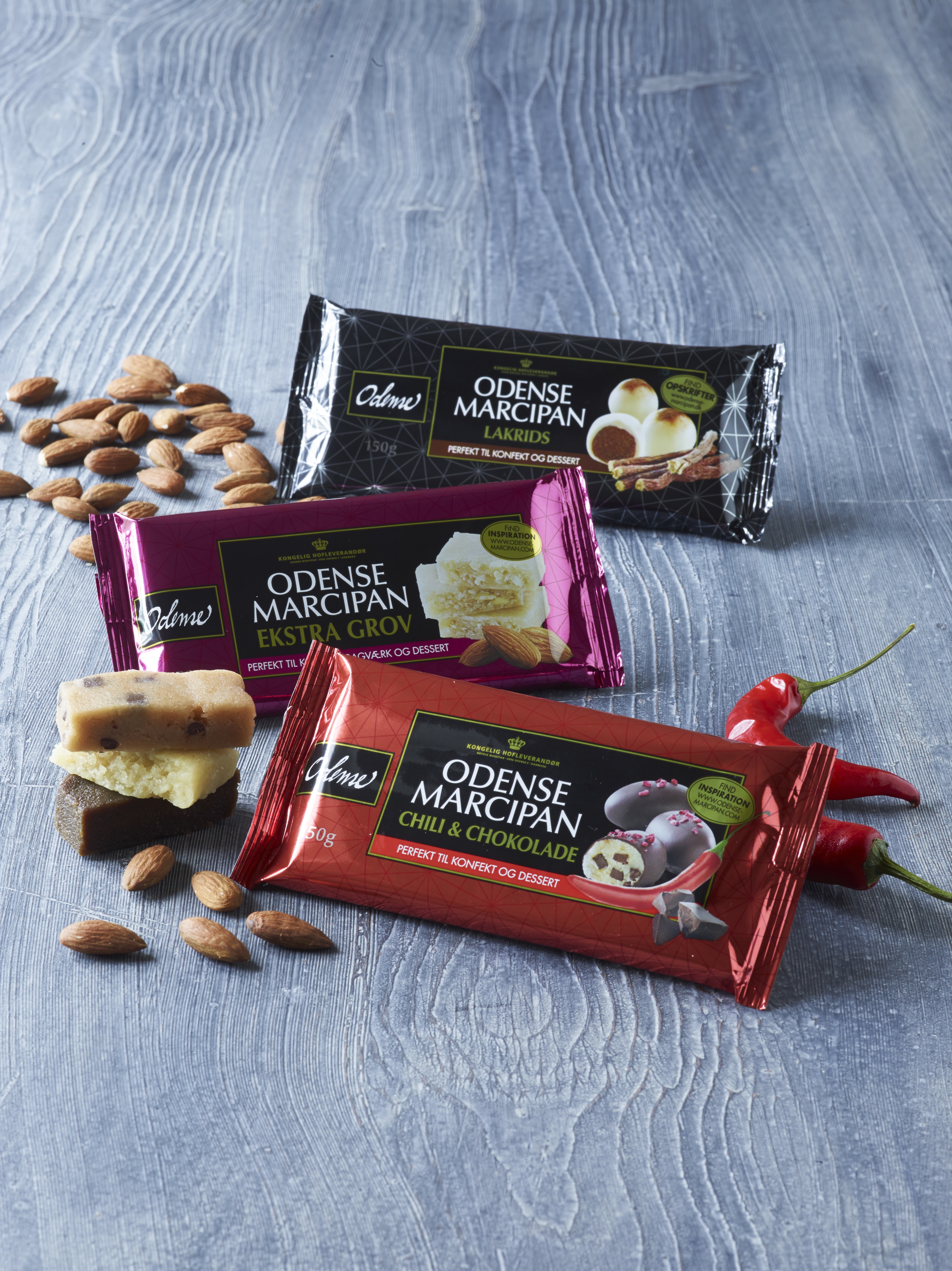 Årets færdigblandede marcipaner fra Odense Marcipan udfordrer endnu en gang smagsløgene. Den hotte nyhed er en marcipan med chili og chokoladestykker, og den smagfulde nyhed er en ekstra grov marcipan med en tydelig sødmefyldt smag af mandler.