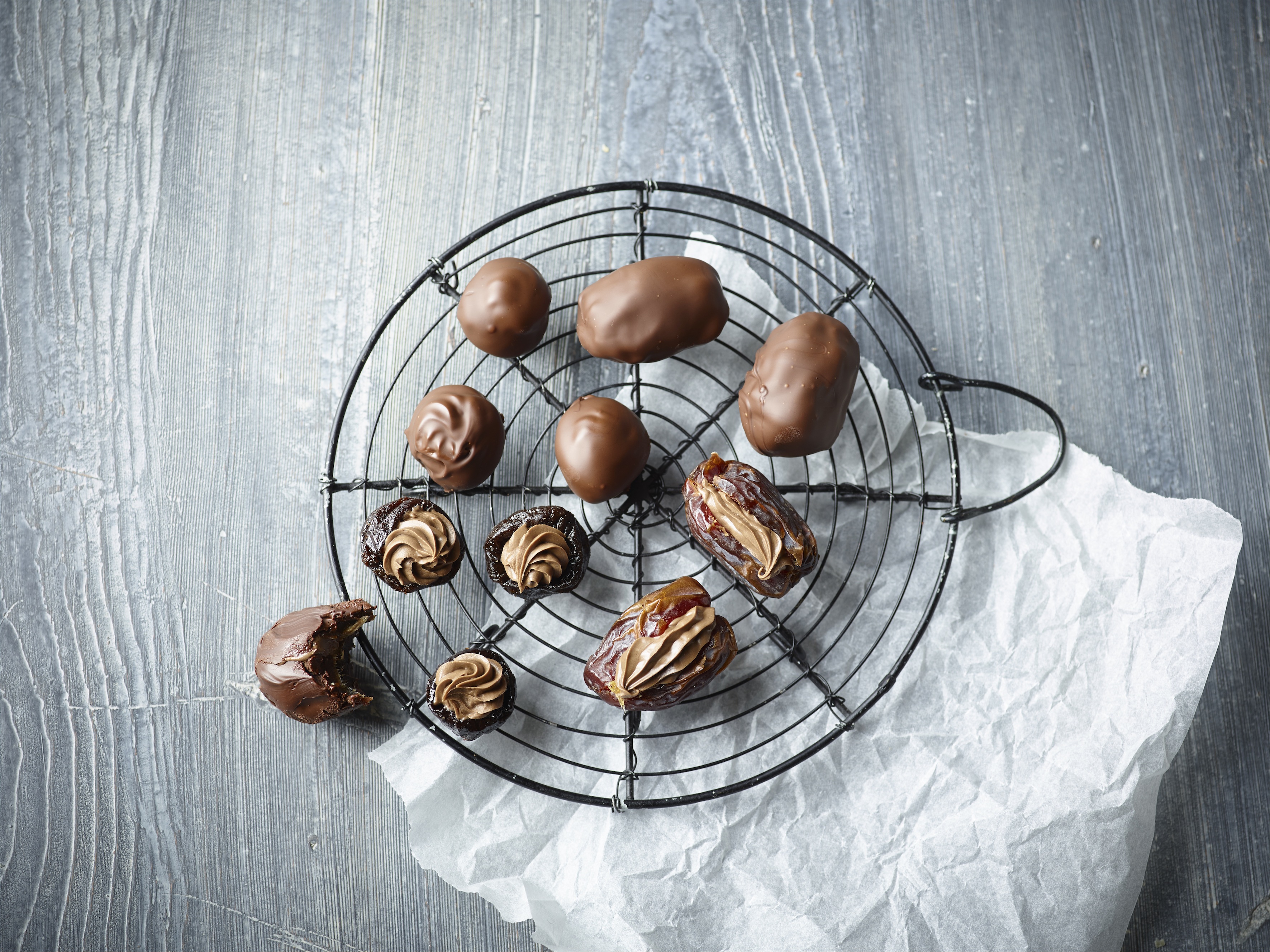 Åbn dadlerne og lav en fordybning i sveskerne med tommeltotten. Dryp dem evt. med lidt cognac, cointreau, portvin eller hvad der måtte stå i skabet. Sprøjt nougaten ned i åbningen, så de bliver fyldt ud og sæt dem på køl. Overtræk dadlerne og sveskerne med tempereret chokolade.