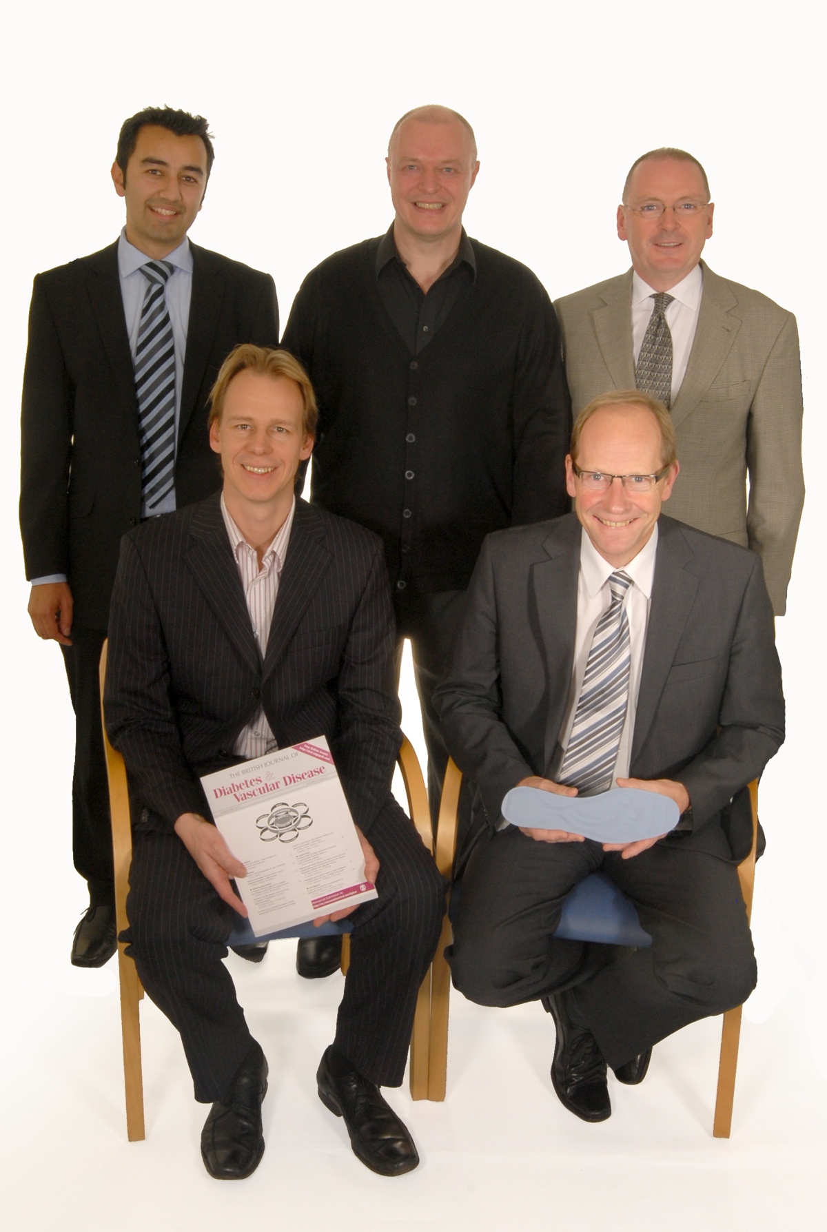 Det britiske team som forestod testen: Bagerst fra venstre Tamim Siddiqui, Department of Vascular Surgery, Hairmyres Hospital, East Kilbride; Raymond Hamill, Research and Development team at National Health Service Lanarkshire og Monklands Hospital i Airdrie; William Munro, Orthotist fra Diabetes Centre på Hairmyres Hospital og medlem af National Centre for Prosthetics and Orthotics ved University of Stratchclyde i Glasgow. Forreste række fra venstre: Donald Bain, Vascular Consultant, Diabetes Centre and the Department of Vascular Surgery, Hairmyres Hospital; Duncan Stang, Advanced Specialist Podiatrist ved Diabetes Centre ved Hairmyres Hospital, tillige er han National Diabetes Foot Coordinator for Skotland.