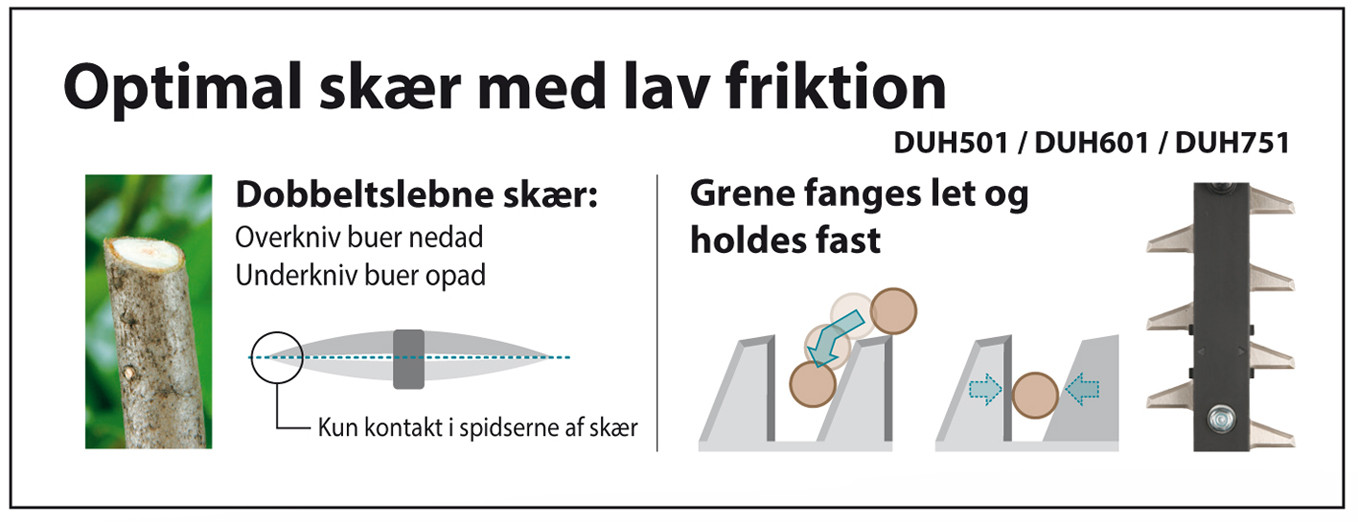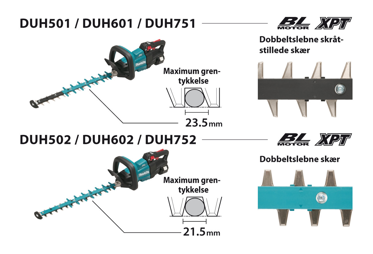 Makitas nye batteri-modeller DUH501 og DUH502 har kraftfulde, kulfrie motorer med et slagantal på op til 4.400 pr minut og elektronisk bremse. Med sværdlængder på 50/60 eller 75 cm er der en model til alle. De nye dobbeltskær klarer op til Ø 23,5 mm grene, hvilket gør maskinerne til et både professionelt og miljøvenligt valg.