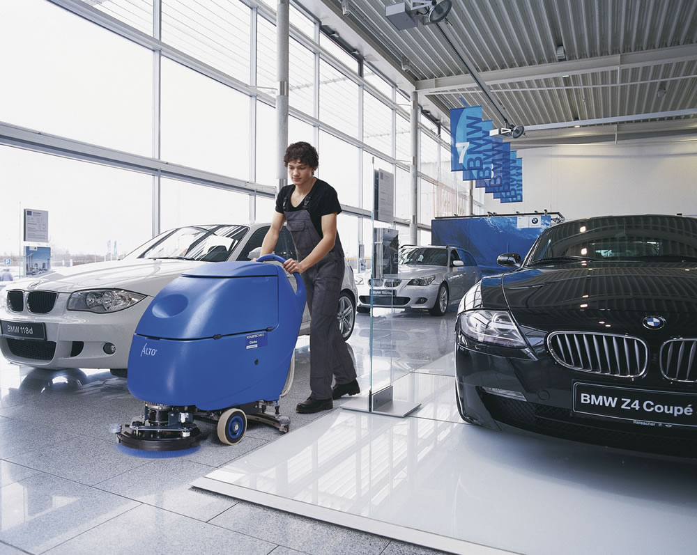 Nemlig at maskinerne er såre enkle at betjene og derfor lette at bruge, mens den effektive rengøring af gulvene står på. For eksempel på hospitaler, i forretninger og produktionsanlæg. Hos bilforhandlere og på værksteder. I varehuse, restauranter og på hoteller samt andre steder, hvor gulvene bare skal være rene.