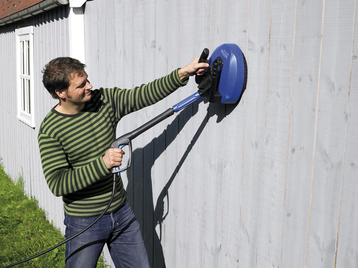 Hvis fliserne er meget snavsede, opnår man det bedste resultat, ved at starte med at sætte "fliserne i blød". Sprøjt f.eks. Nilfisk Træ- og fliserens ud på fliserne. Dette gøres med en Skumsprayer. Vent nogle minutter inden snavsen spules af - enzymerne i sæben skal have lidt tid til opløse snavset. Skummet må dog ikke tørre ind. Skumsprayer følger med som standard på de fleste Nilfisk højtryksrensere.