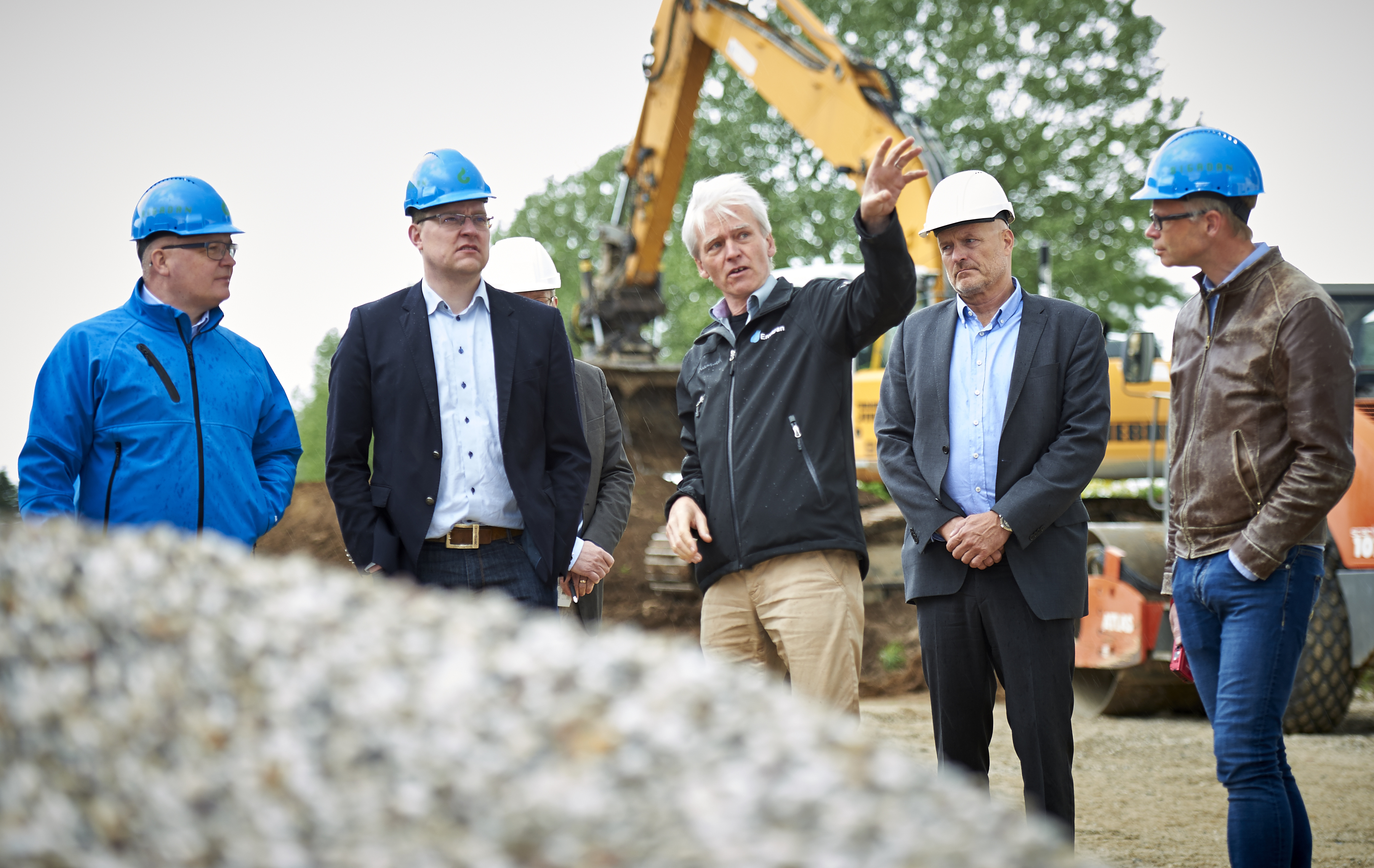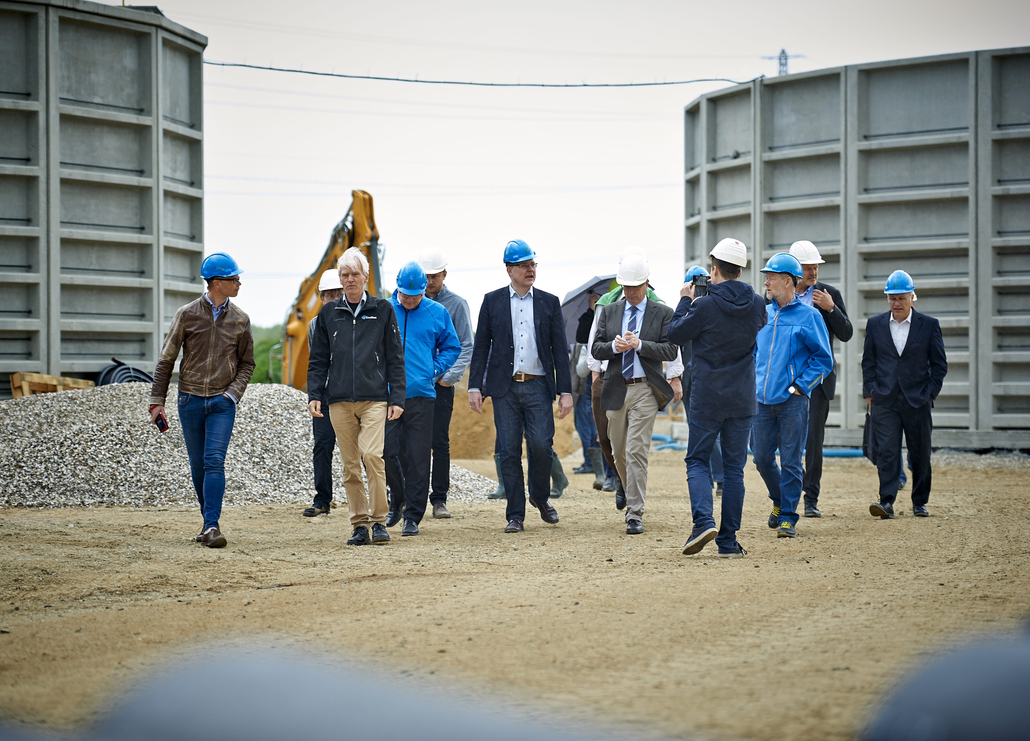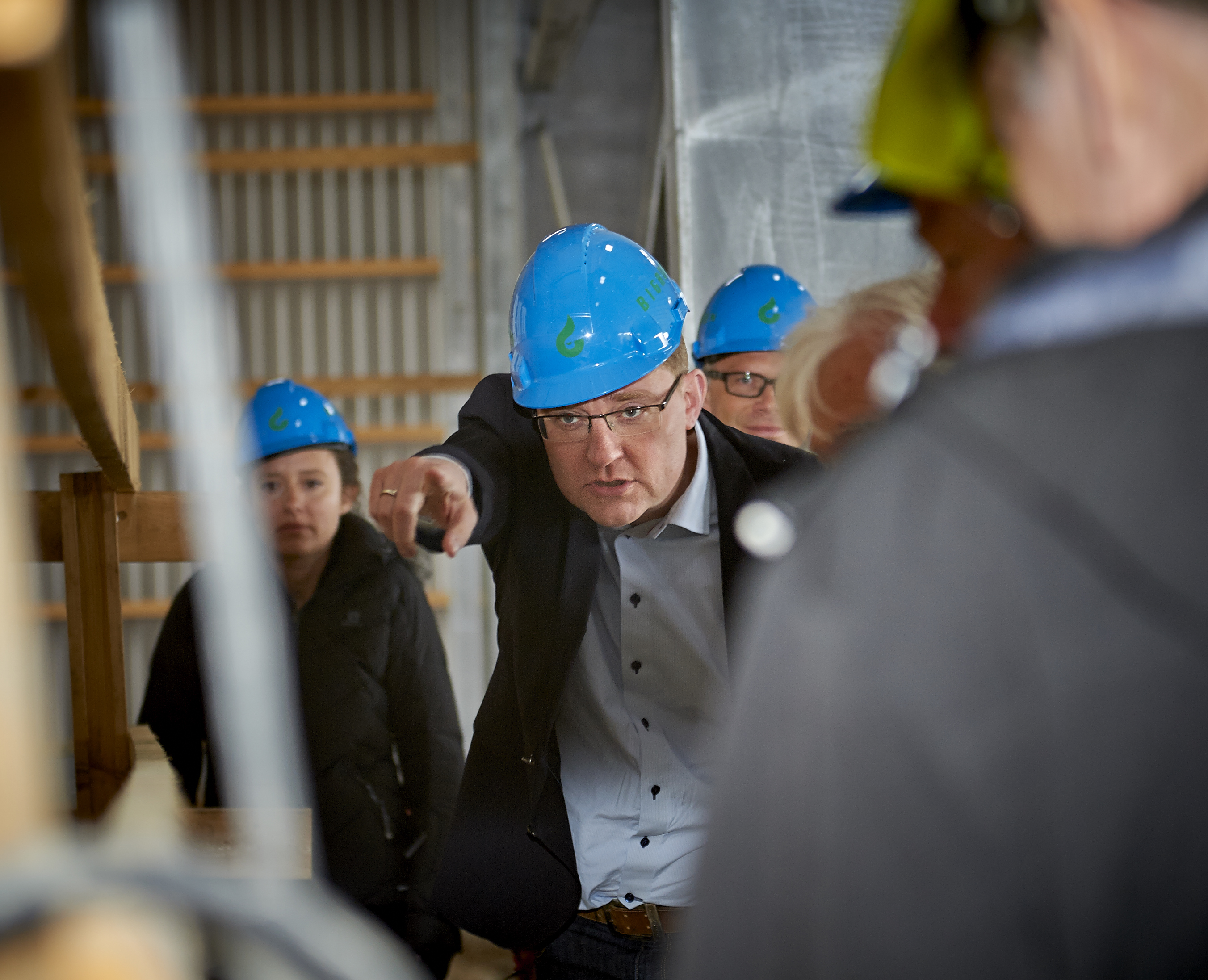 Klima- og energiminister Rasmus Helveg Petersen vist rundt på byggepladsen, hvor unikt biogasanlæg opføres