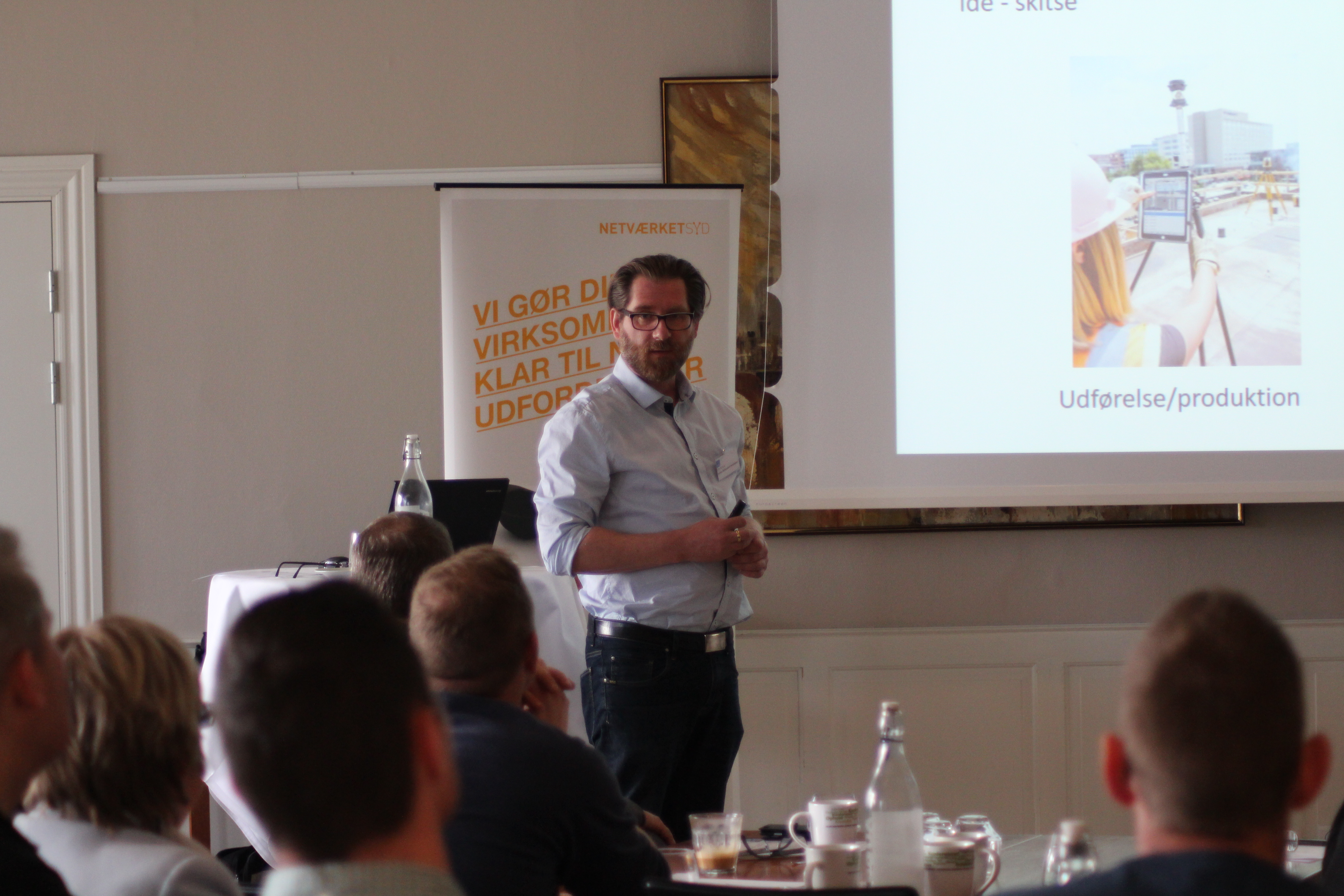 Hans Birkendorf og Ole Schou fra SCHOU BIRKENDORF arkitekter rundede første halvdel af med at takke Netværket SYD for at få lov til at komme og være oplægsholder. Arkitektvirksomheden oplyste, at deres kunder primært er kommuner i Vestsjælland, boligselskaber samt private bygherrer, firmaer og virksomheder. I 2016 er der fuld gang i en lang række spændende nye og kommende byggeaktiviteter herunder blandt andet ombygning af Slagelse Teater, ombygning af Vig Skole, opførelse af nye botilbud for Odsherred Kommune, modernisering af Havnehallen i Odden Havneby og udvikling af et nyt boligområde i Holbæk. SCHOU BIRKENDORF arkitekter afsluttede et spændende oplæg med at fortælle om nye spændende tiltag på den tekniske side med blandt andet digital opmåling og registrering ved hjælp af droner.
