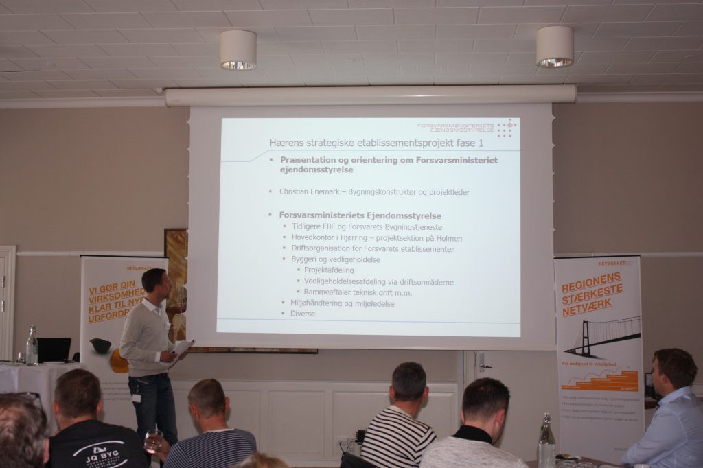 Dagens næste oplægsholder, projektleder i Forsvarsministeriets Ejendomsstyrelse, Christian Enemark, fortsatte netværksmødet med at informere om forsvarets porteføljer, herunder planerne for renovering af flere kaserner på Sjælland, herunder Den Kongelige Livgardes hovedkaserne, Garderkasernen i Høvelte, og Garderhusar kasernen, på Antvorskov kaserne i Slagelse.