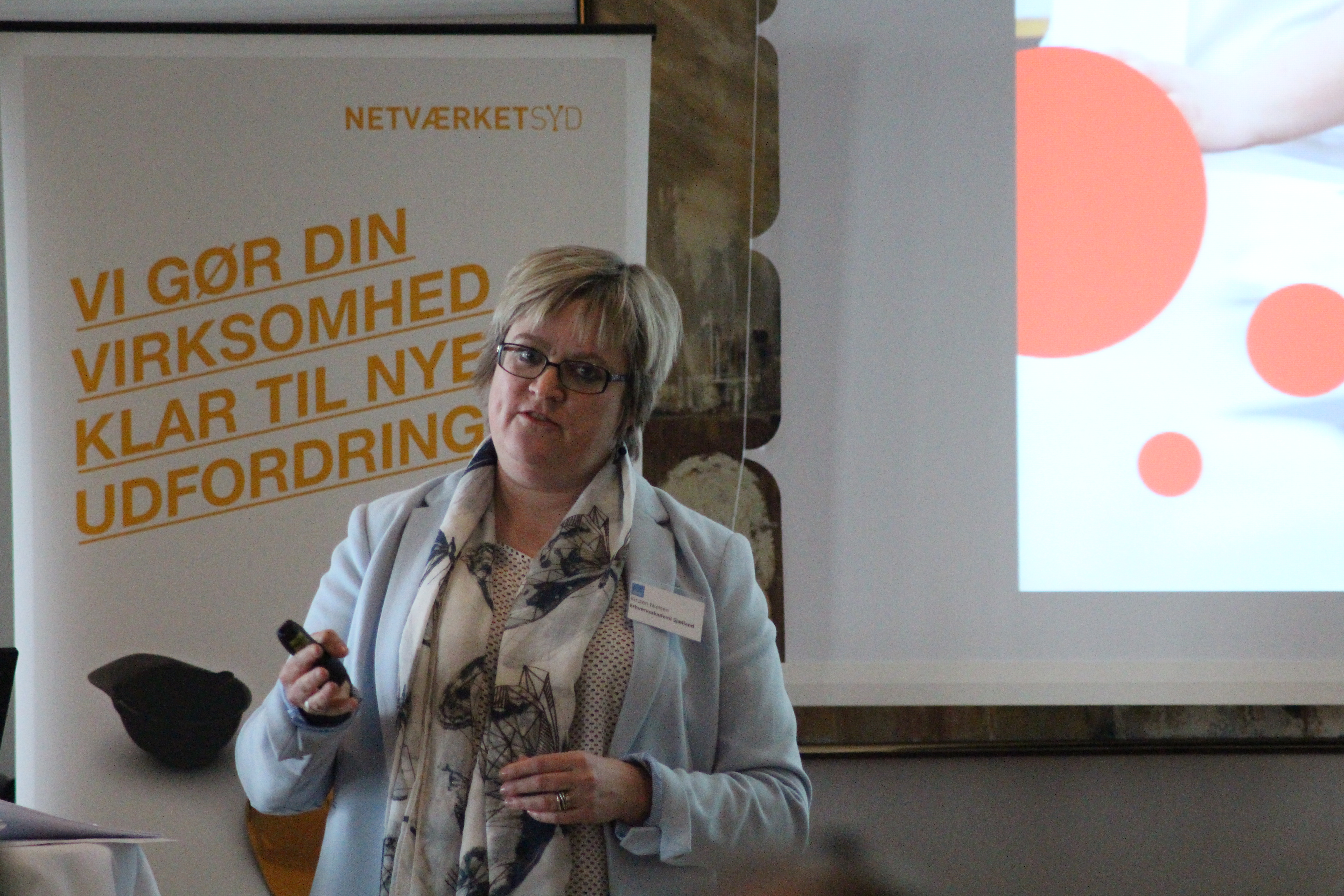 Kirsten Nielsen, studieleder fra Erhvervsakademi Sjælland, overtog mikrofonen og gennemgik de mange spændende muligheder, der er for skabe et udbytterigt samarbejde mellem erhvervsakademiets 3000 årsstuderende og erhvervslivet gennem praktik- og projektsamarbejder. Kirsten Nielsen forklarede, at mange virksomheder er meget tilfredse med at få en praktikant, som kommer med friske kræfter og nye faglige perspektiver. Praktikperioden varierer, men de fleste uddannelser har som oftest 10-12 ugers praktik.