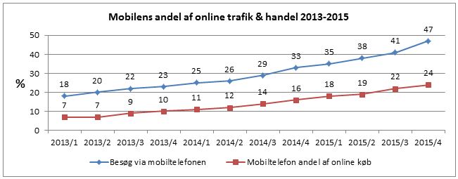 Mobilen vinder hastigt ind på både computer og tablet - Nye tal fra Demandware viser, at mobiltelefonen trækker en meget stor del af væksten i trafikken på webshops og det forventes at over halvdelen af trafikken kommer fra mobilen næste år. Som noget nyt afslutter forbrugerne også handlen på mobilen.