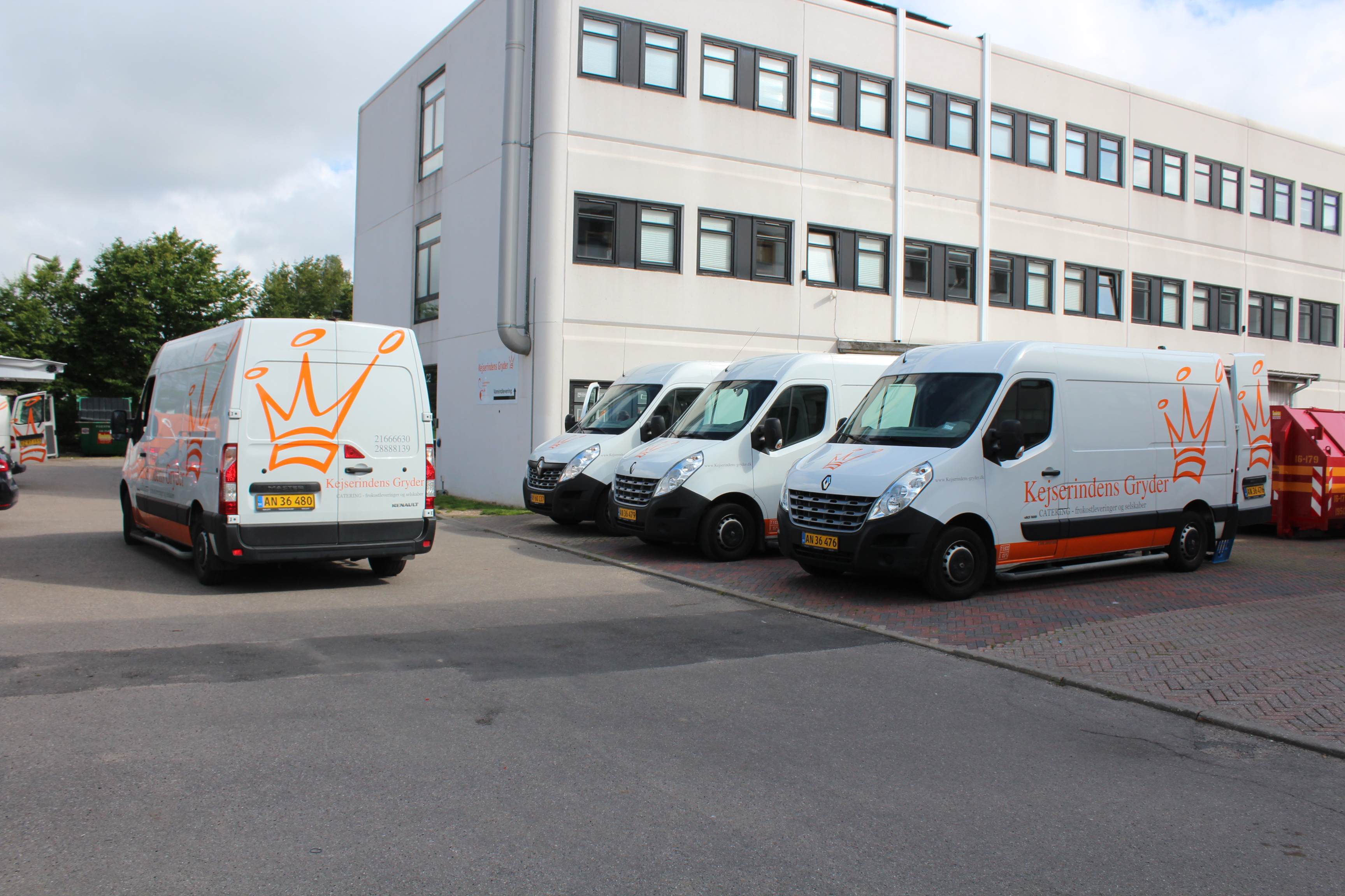 De 10 kølebiler er alle af den ekstra rummelige model Renault Master og er leveret med specialmonteret Webasto køleudstyr. Kejserindens Gryder kører frokost og catering ud i kølebilerne til kunder i hele Hovedstadsområdet samt til Sydsjælland og Falster, hvor virksomheden har en større kundekreds efter i en periode at have forpagtet caféen på transportcentret Cargo Syd.