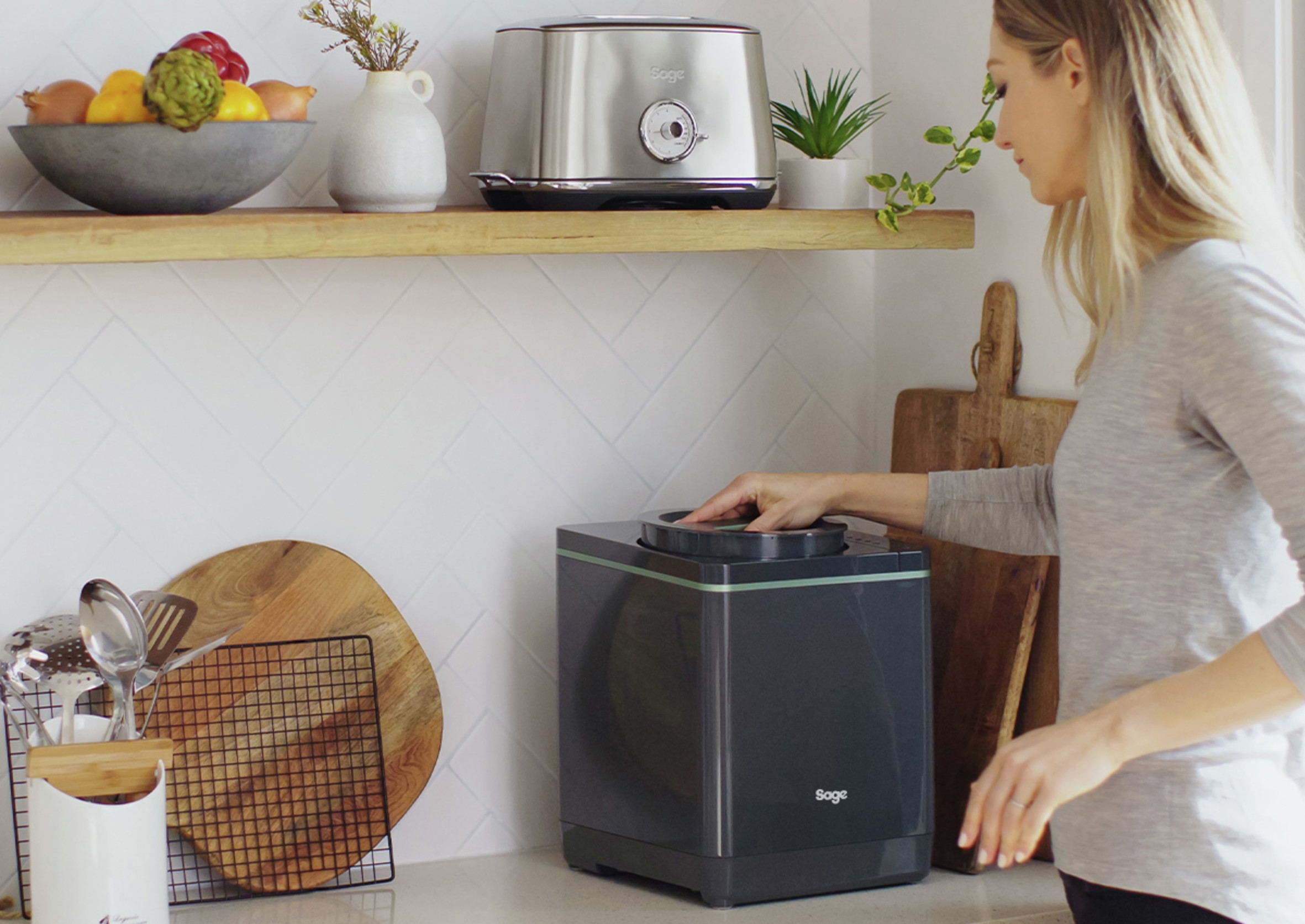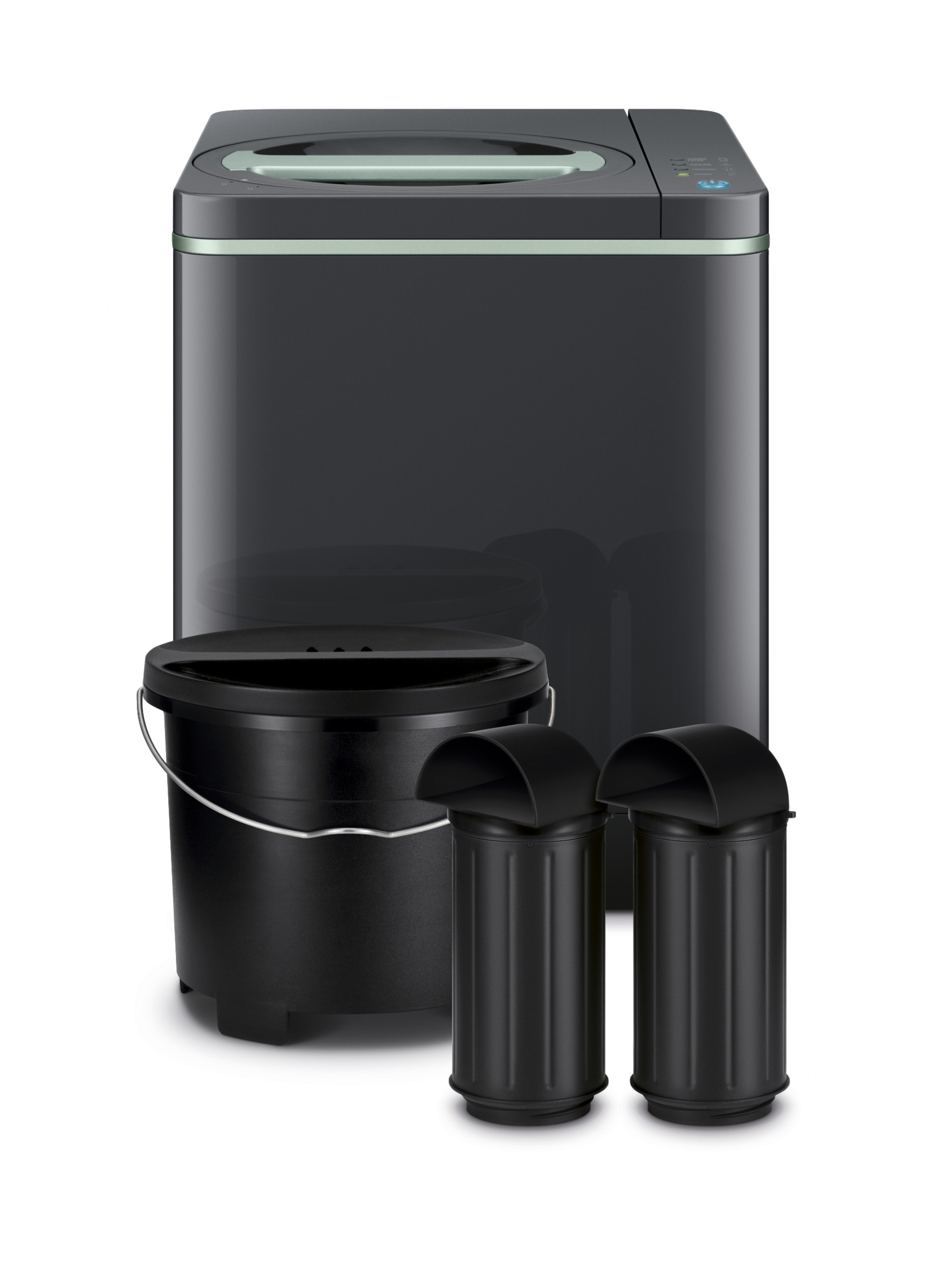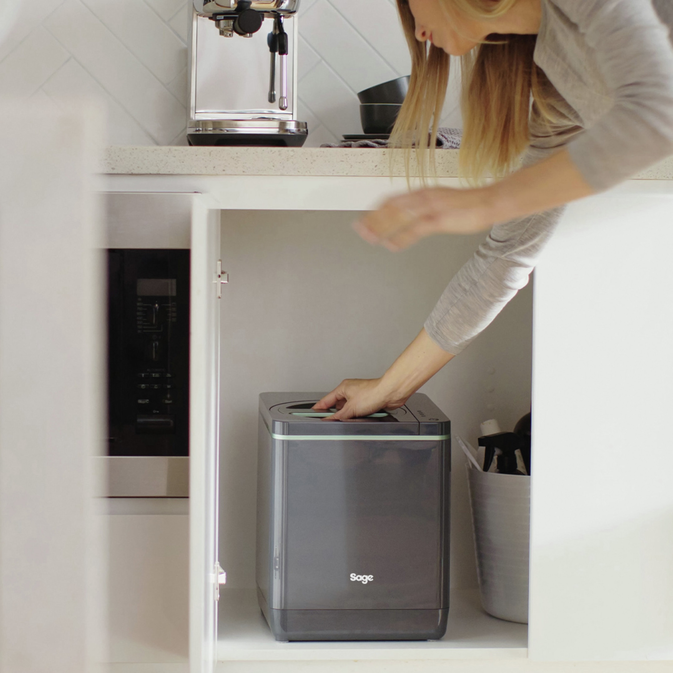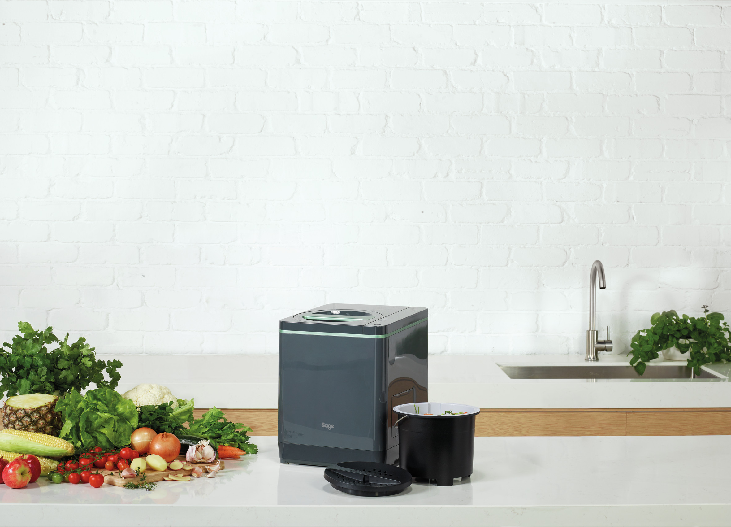 Sages lille, smarte kompostspand til køkkenet transformerer dit husholdningsaffald til lugtfri, tørrede økochips på under 4 timer. Dine madrester og øvrige køkkenaffald tørres, formales, afkøles og reduceres til lugtfri økochips, dvs. gratis, næringsrig muld til din køkkenhave eller stueplanter. Samtidig mindskes mængden af dit køkkenaffald med over 80%, så du slipper for at gå ud med skraldet så tit. Det hele foregår i spanden, som står i dit køkken.
