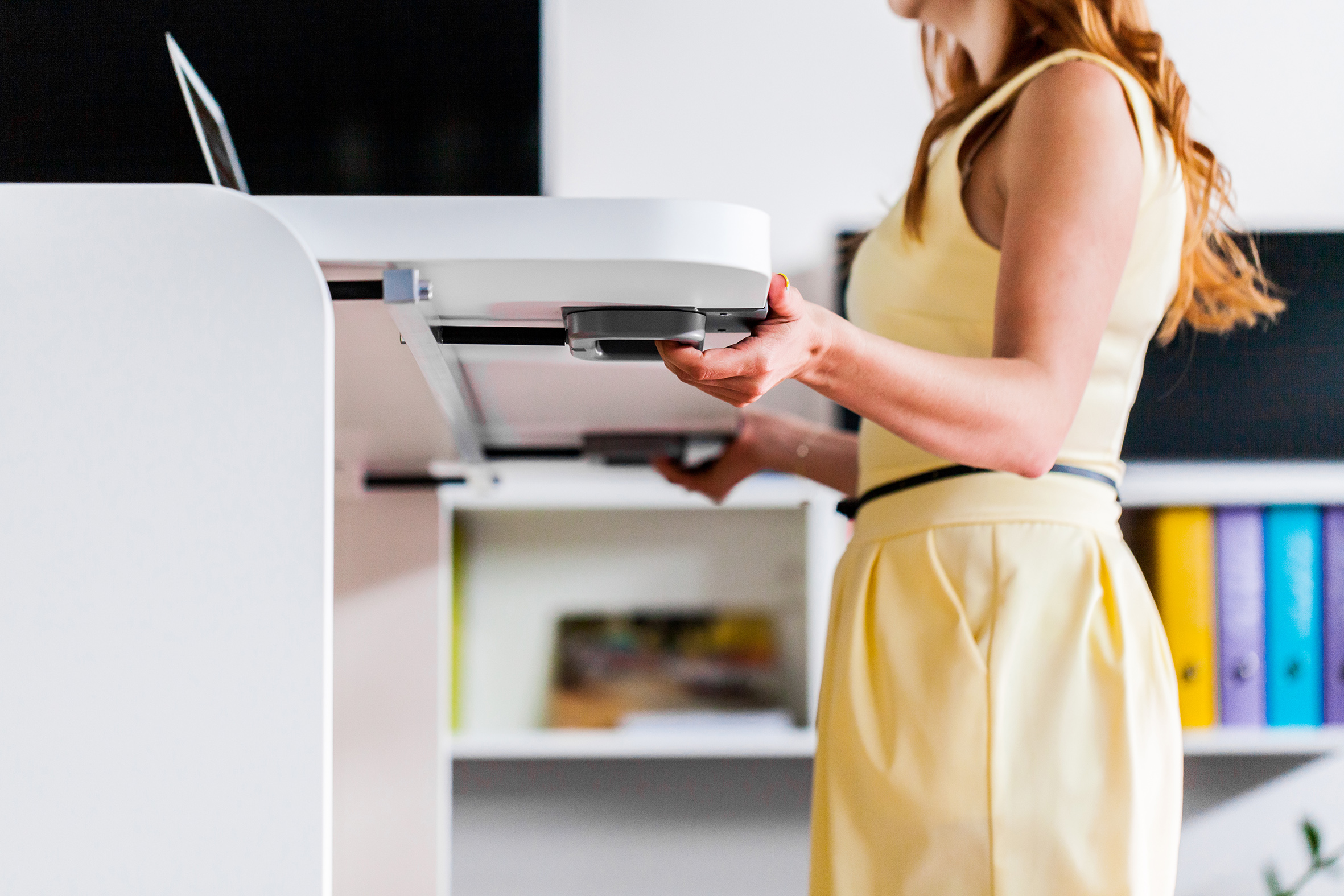 Design dit eget Stand Up skrivebord, så det passer til dig Stand Up har et stilrent udtryk og et unikt add-on system, der giver mulighed for flere ekstra funktioner, opbevaringsmuligheder og designmæssige detaljer. Det er muligt at integrere tilkoblingssystemer så som Air Charger og USB. Du kan også vælge at få printet dit eget billede, produkt, logo eller citat på endegavlen af skrivebordet for en unik visuel effekt.