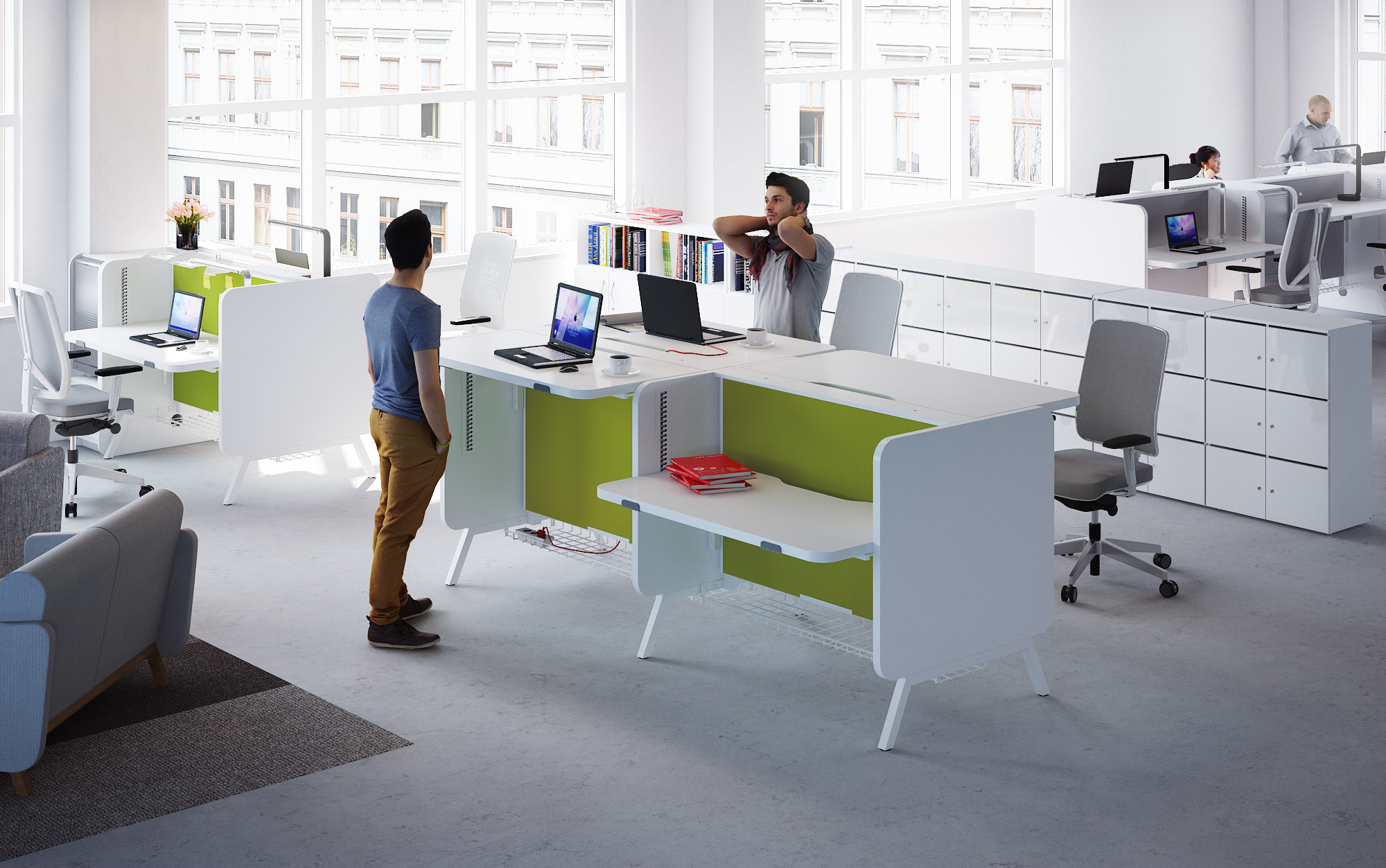 Design din egen arbejdsplads, så den passer til dagens opgaver Stand Up skrivebordet er skabt til forandring og forvandles let fra en privat arbejdsplads til et projektbord, der sammen med andre Stand Up skriveborde kan udvides yderligere. Opbygningen og kombinationen af flere Stand Up skriveborde skaber dermed et dynamisk kontormiljø, der kan forandres efter behov. Anvendes Stand Up derimod som en siddende arbejdsplads, sørger afskærmningen for en optimal akustik til arbejdsro og telefonsamtaler.