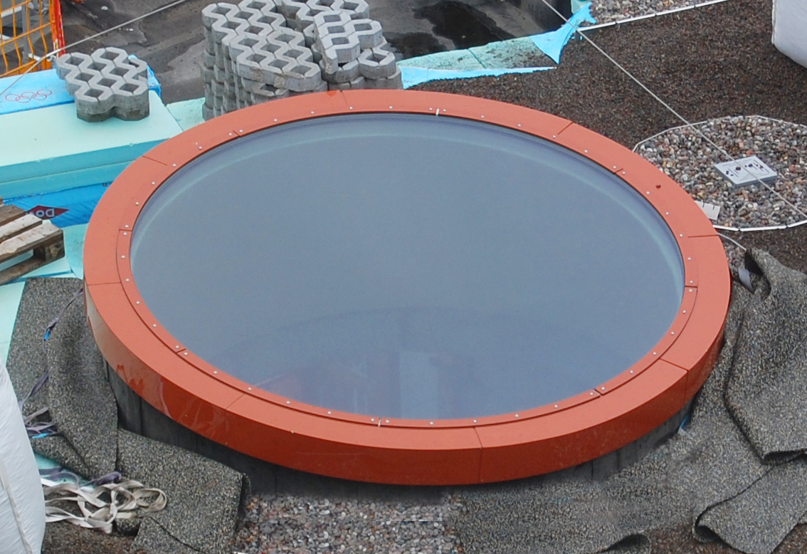 OvenlysKompagniet og Lamilux har designet og leveret de 5 runde ovenlys med karmopbygning, der sidder i toppen af tårnene, har en diameter på op til 3 meter og består af ét glas. Ovenlysene er lavet i det EPD-certificerede og specialudviklede glastagssystem PR60.