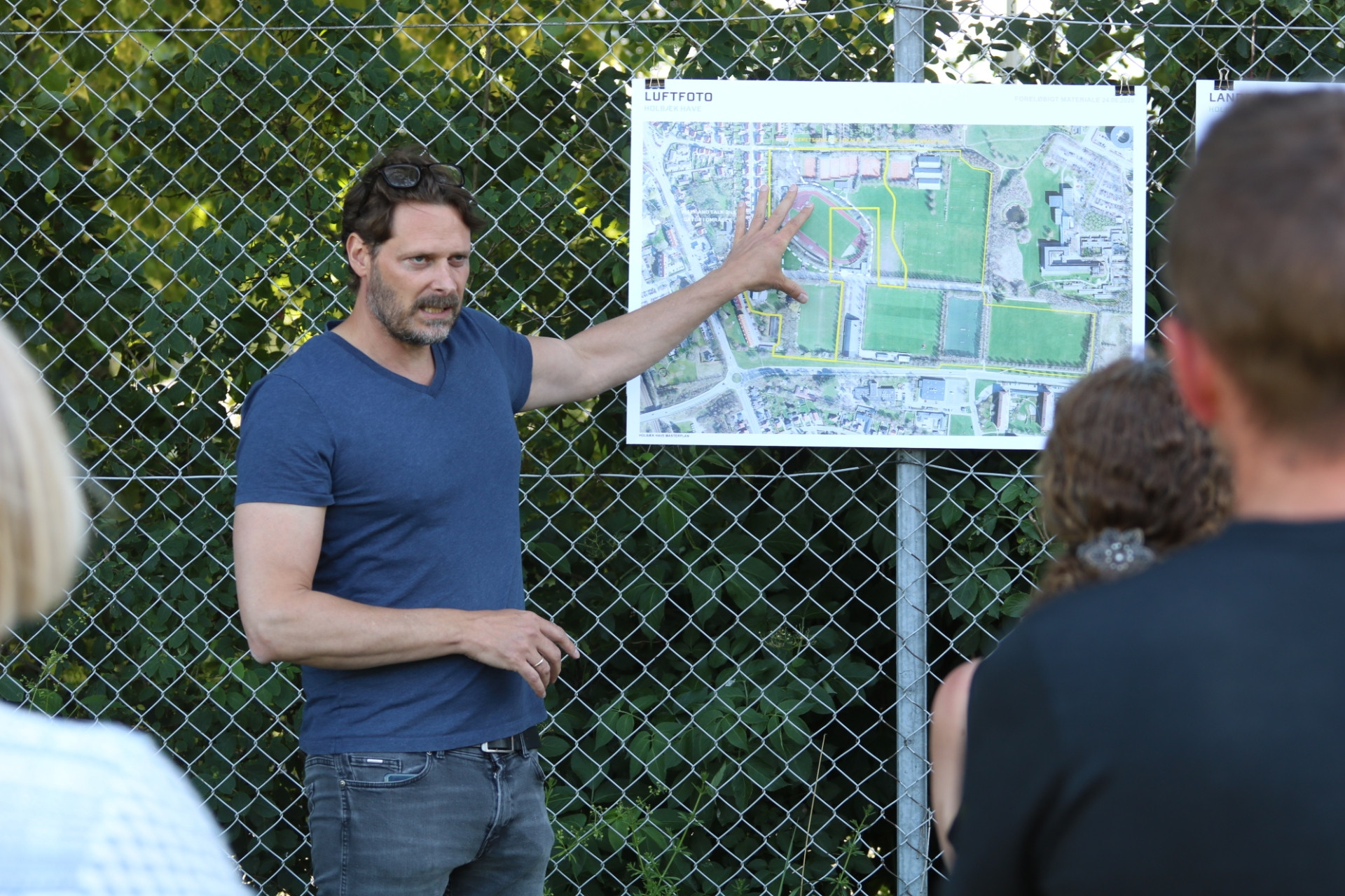 Tekst: | Byplanlægger Mads Næsgaard Schmidt fra Holbæk Kommune bød velkommen til de fremmødte borgere på onsdagens ”walk and talk” på det gamle stadionområde, hvor den nye bydel Holbæk Have snart skyder op og skaber plads til 2.000 nye Holbæk-borgere. |