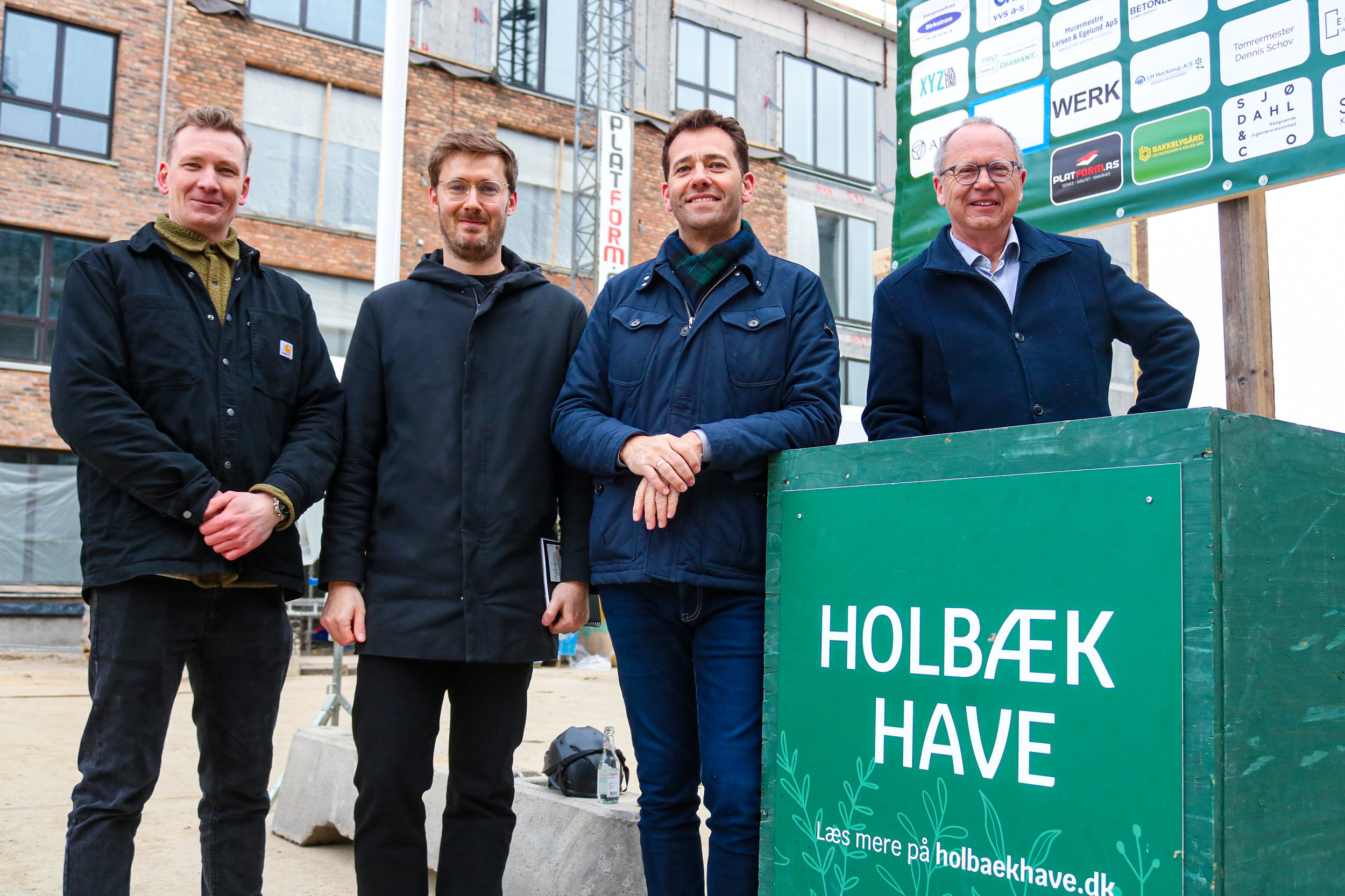 Tekst: | Talerne ved onsdagens rejsegilde ved Primula Hus i Holbæk Have var fra venstre: Projektleder Torben Vestergaard fra styringsentreprenøren Ingcon A/S, arkitekt Søren Yde fra Holscher Nordberg A/S samt byggedirektør Jacob Hovmøller og adm. direktør Hans-Bo Hyldig fra projektudvikler og bygherre FB Gruppen A/S |