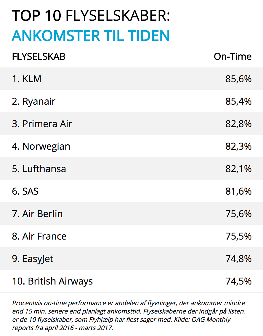 Flyselskaber der oftest ankommer til tiden