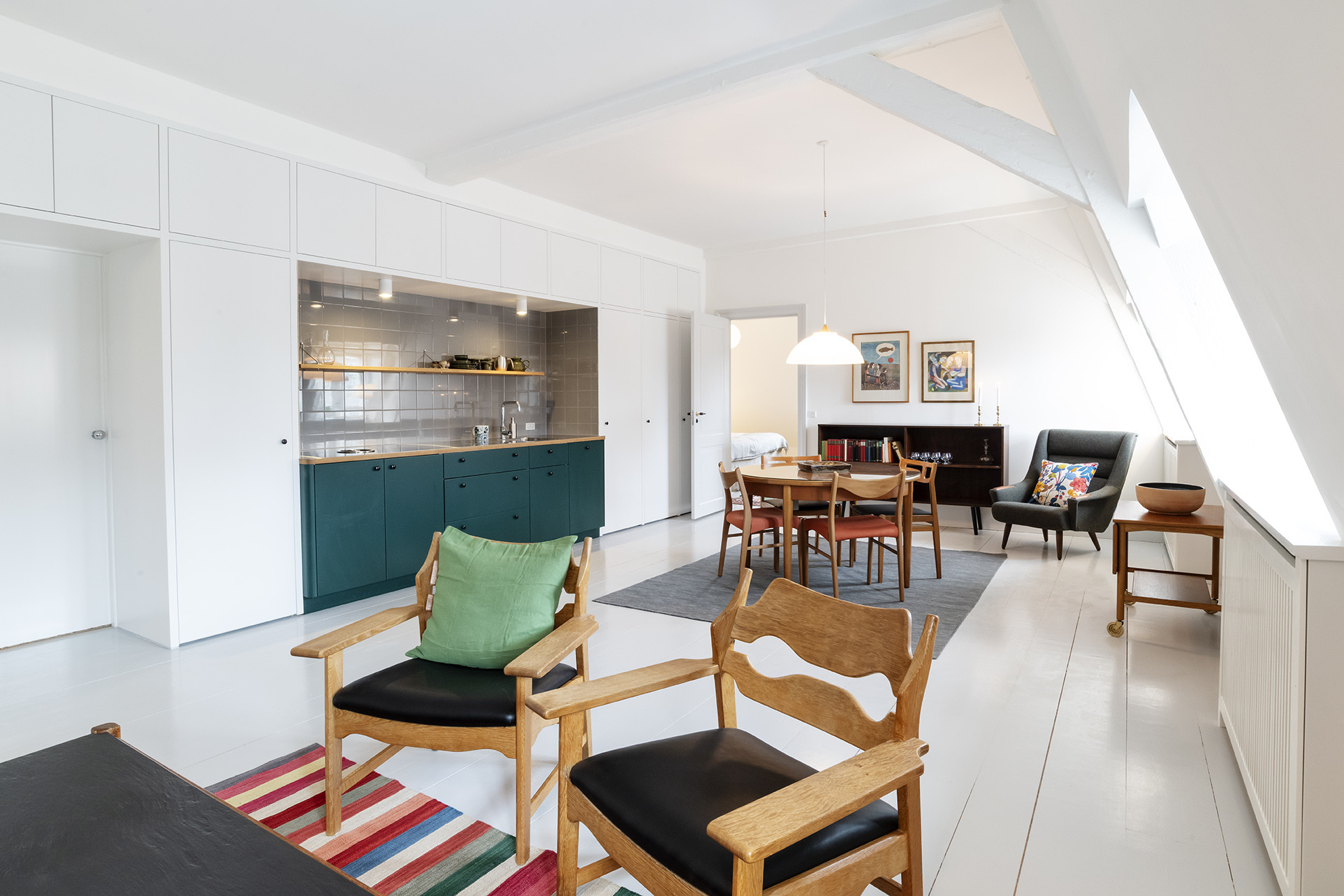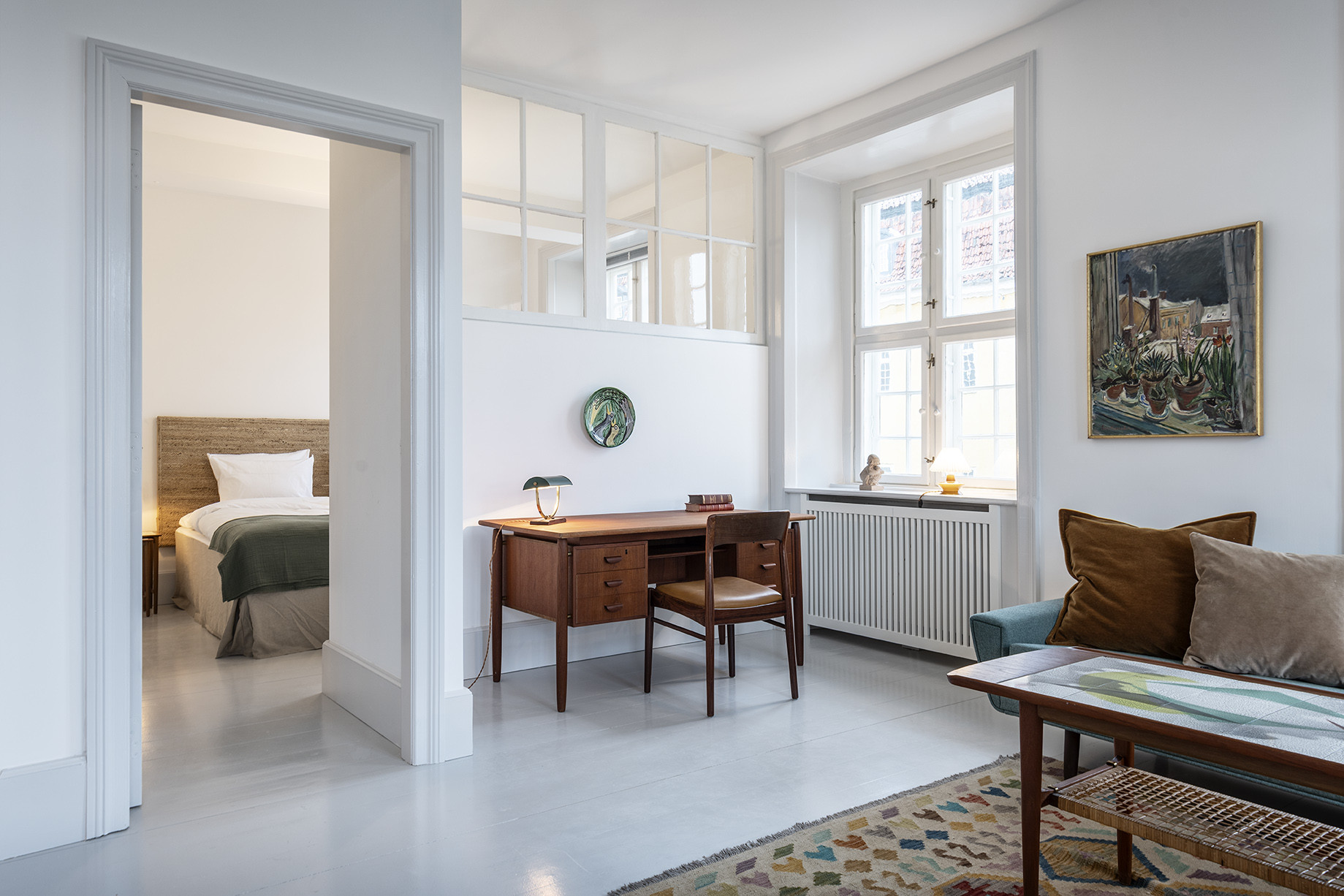De 14 hotellejligheder er oprindeligt tænkt som små ”hjem” for folk, der for en kortere eller længere periode skal finde sig et at bo i den danske hovedstad. Det kan være udstationerede forretningsfolk, forskeren eller andre, der befinder sig i et mellemrum mellem to hjem. Kort sagt alle, som ikke kan bære tanken om at bo på hotel, men ønsker at finde hjemlige rammer og blive en integreret del af livet i byen under deres ophold. Lejlighederne, der indeholder alt, hvad man har brug for i et hjem, skaber netop sådanne rammer med deres unikke stil inspireret af dansk design fra 1930-1970. Det er indretningsfirmaet EEN, som har stået for hele husets udtryk og stemning, og altså også lejlighederne. Alt er håndplukket fra møblerne, der er nænsomt ompolstret, til billeder til stel og bestik. Der er taget stilling til alle detaljer.