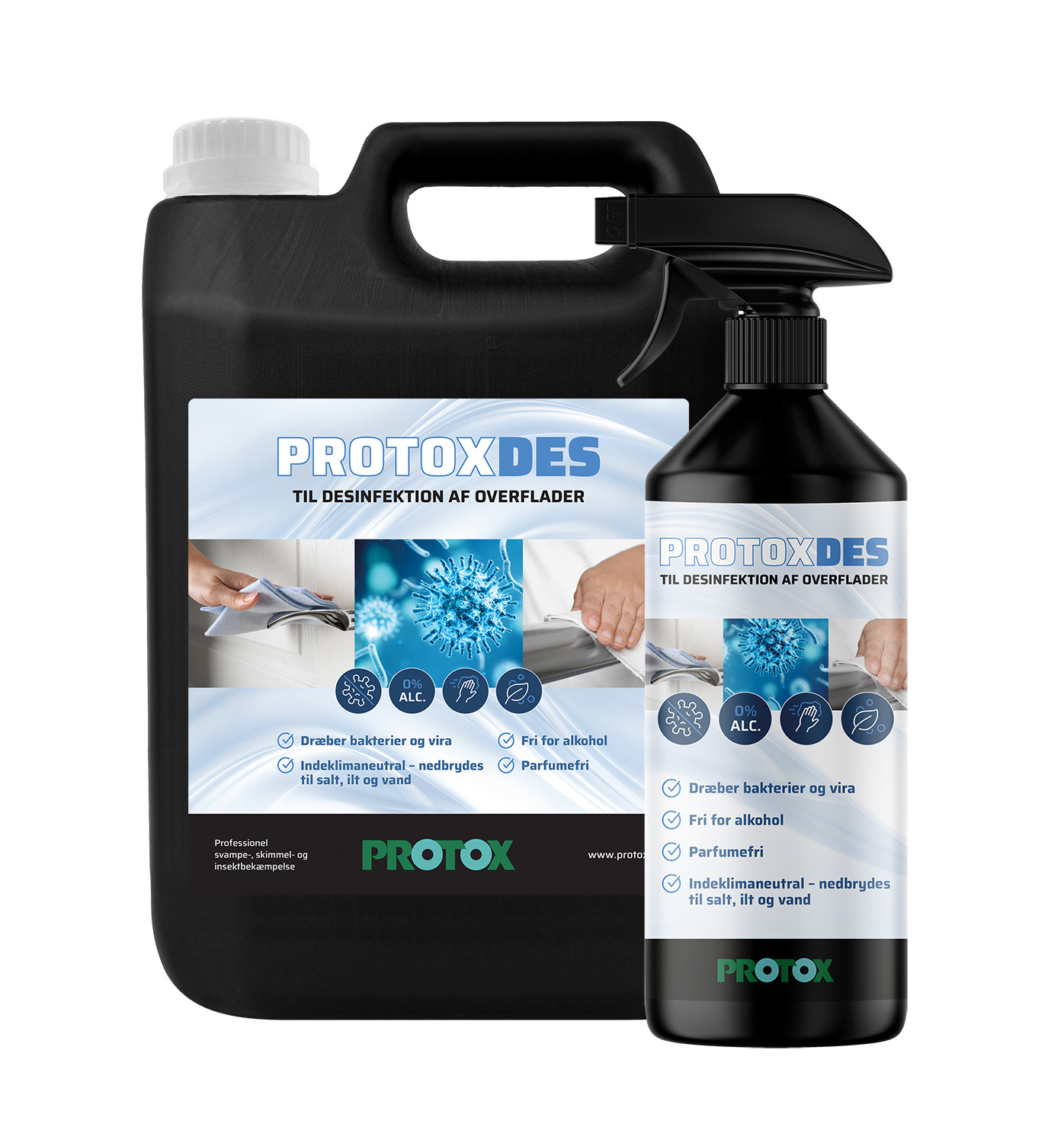 Protox har udviklet ProtoxDES - et nyt og effektivt desinfektionsmiddel baseret på det naturligt forekommende stof hypochlorsyre, som gør det meget mildt og skånsomt overfor miljø og indeklima. Samtidig er det dog langt mere effektivt i forhold til gængse desinfektionsmidler.