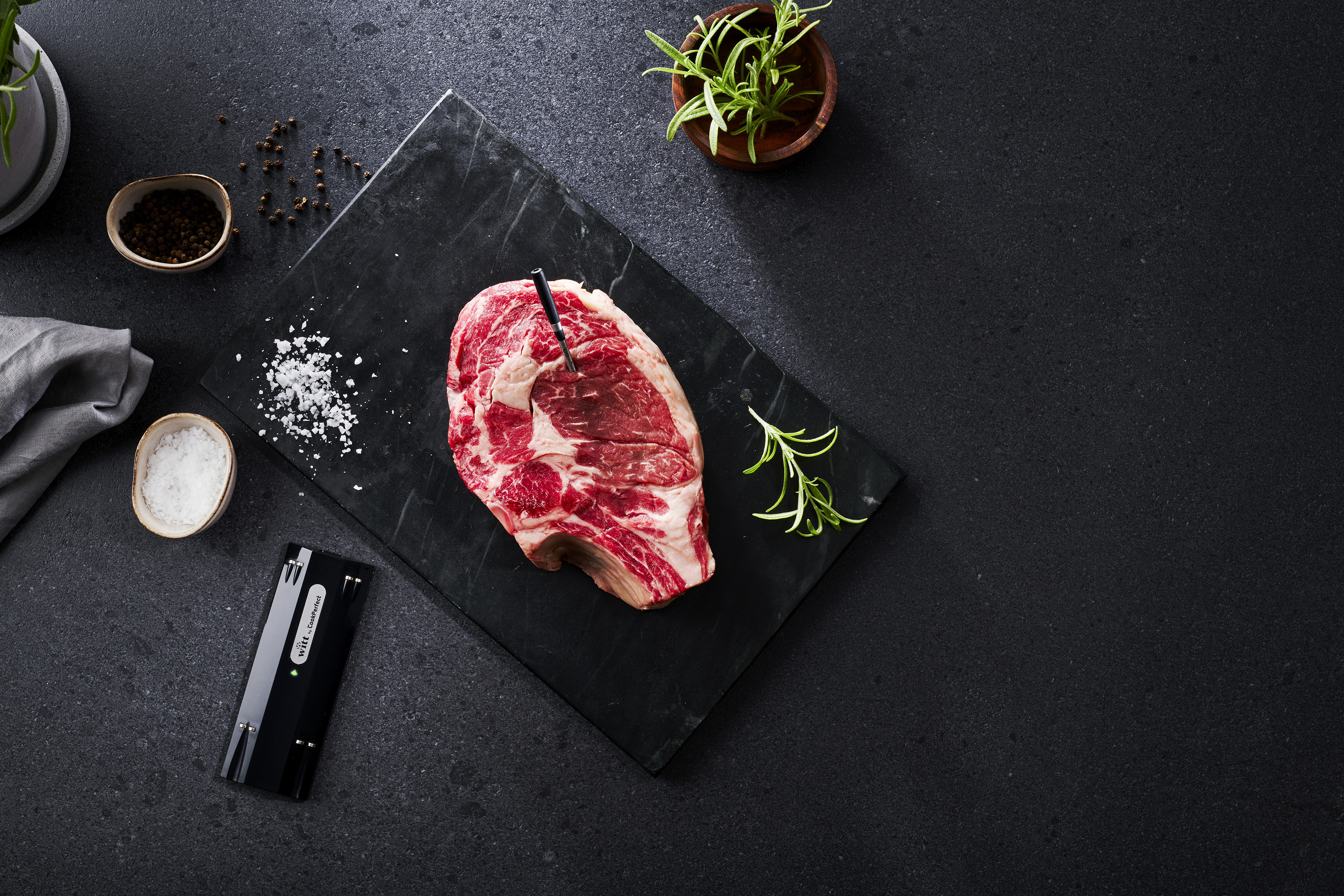 Drømmen om et helt trådløst steketermometer har endelig gått i oppfyllelse med Witt by CookPerfect. Det elegante og stilrene steketermometeret, i kombinasjon med den tilhørende appen, guider deg hele veien frem til et perfekt resultat. Du kan enkelt stille inn om du ønsker kjøttet ditt rødt, rosa eller gjennomstekt, og med appens innovative timer-funksjon kan du også sørge for at kjøttet, potetene og grønnsakene er ferdig til nøyaktig samme tid. Voila, da er det servert …