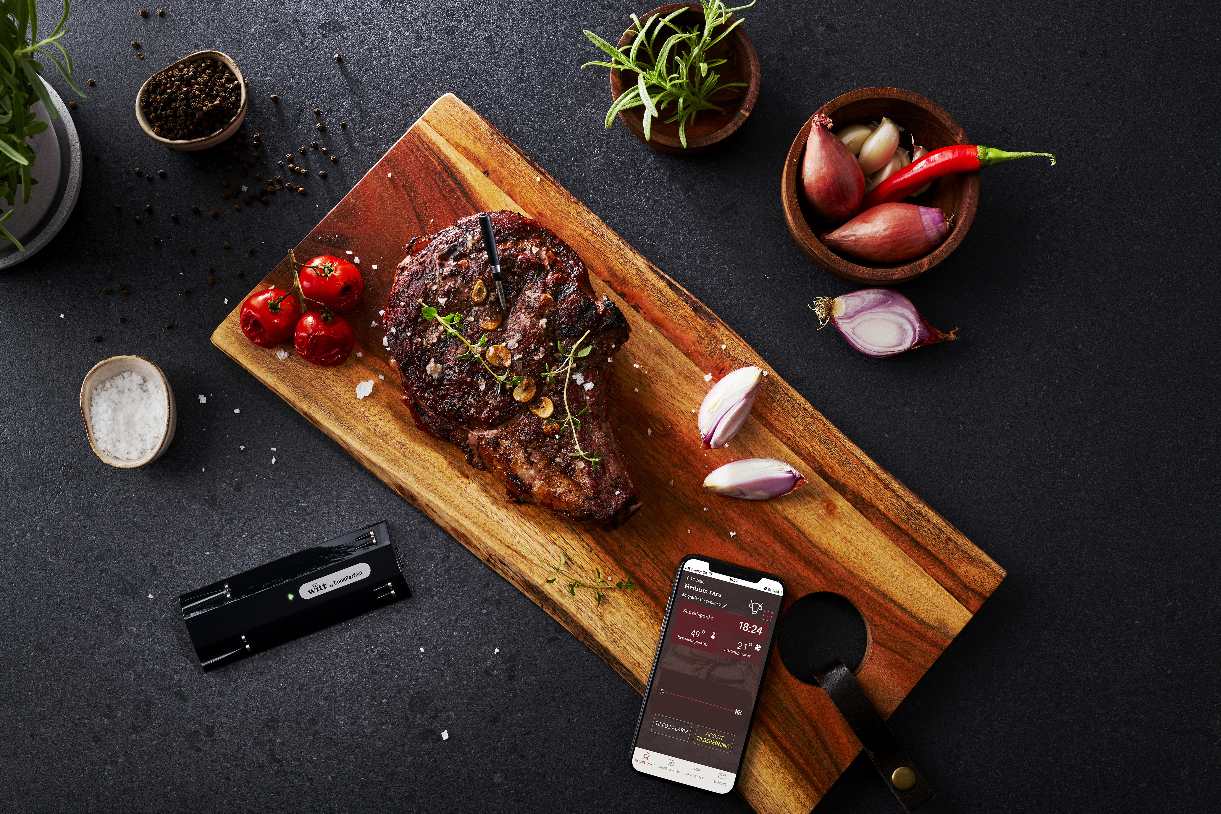 Drömmen om den helt trådlösa stektermometern har äntligen gått i uppfyllelse med Witt by CookPerfect. Den eleganta och stilrena stektermometern i kombination med den tillhörande appen, guidar dig hela vägen till det perfekta resultatet. Du ställer enkelt in, om du önskar ditt kött rött, rosa eller välstekt, och med appens innovativa timerfunktion, kan du även försäkra dig om, att kött, potatis och grönsaker är färdigt exakt samtidigt. Voila – så är det serverat…