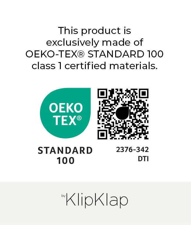 *Gäller alla stoppade möbler med skum och tyg – förutom 4 Fold, 3 Fold, 3 Fold Single och 3 Fold XL, där endast den lilla tygbiten med KlipKlap-loggan inte uppfyller kraven. Alla andra material i dessa produkter uppfyller OEKO-TEX® STANDARD 100, Product Class 1.