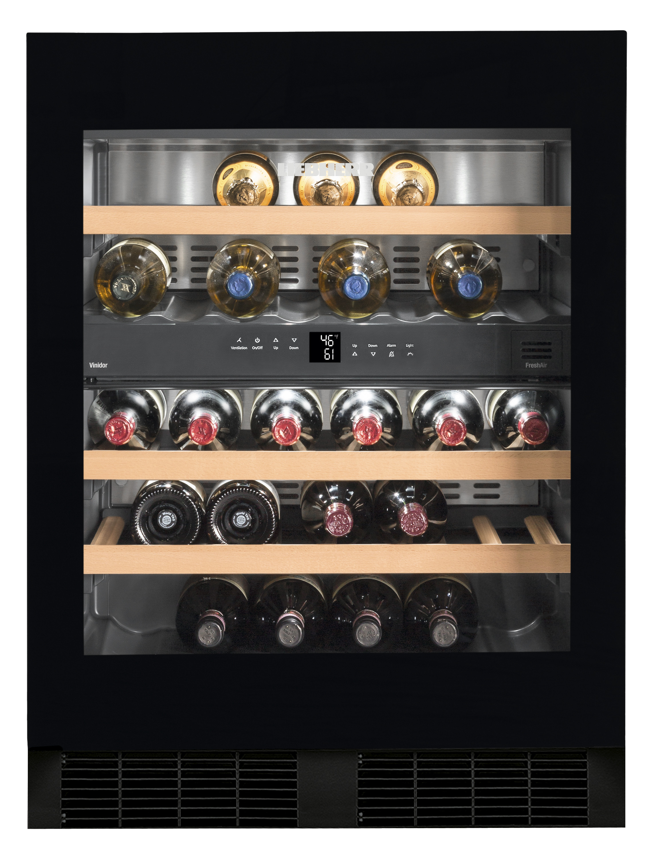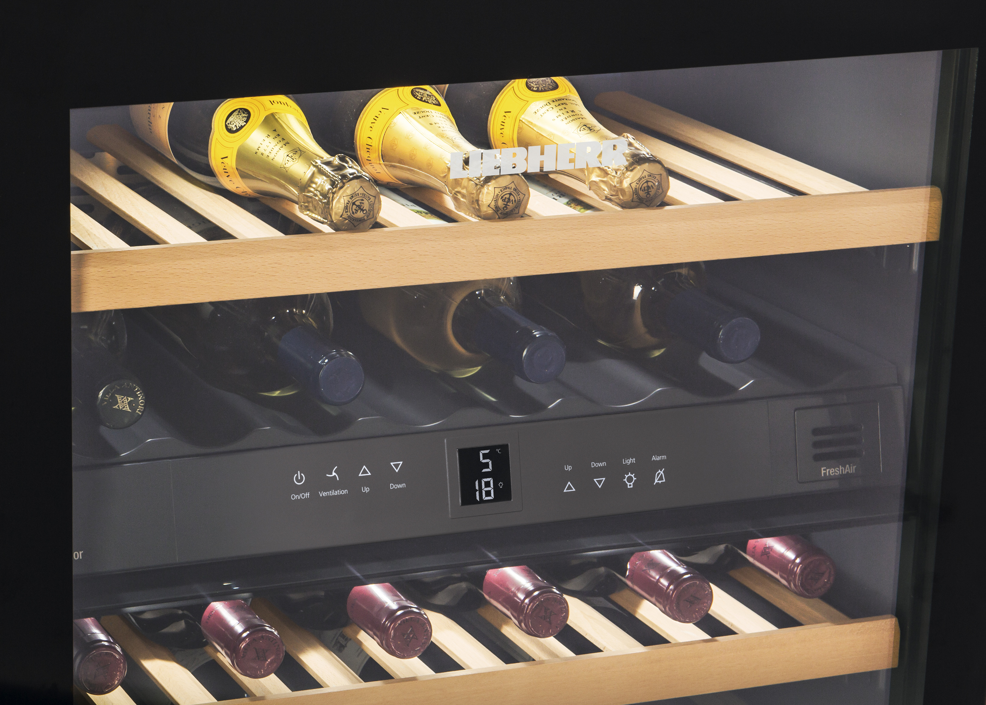 Även lagring av en stor mängd vin görs under ideala förhållanden. Med oberoende temperaturzoner och justerbar temperatur är vinkylen perfekt lämpad för lagring av alla typer av viner. Du kan tryggt lämna förvaringen av dina viner till Liebherr vinkyl. Med det lätt utbytbara FreshAir-aktivt kolfilter, säkerställs ren luft vilket gör att vinets kvalitet bibehålls. Genom detta förhindras att lukt från omgivande luft tränger in i vinet genom korken och därmed påverkar vinets kvalitet. Hyllorna i naturlig, obehandlad bok ger dig den bästa vinförvaringen och med den innovativa och intelligenta vibrationsdämpningen, samt tonat UV-skyddat glas, säkerställs den bästa förvaringen för ditt vin.