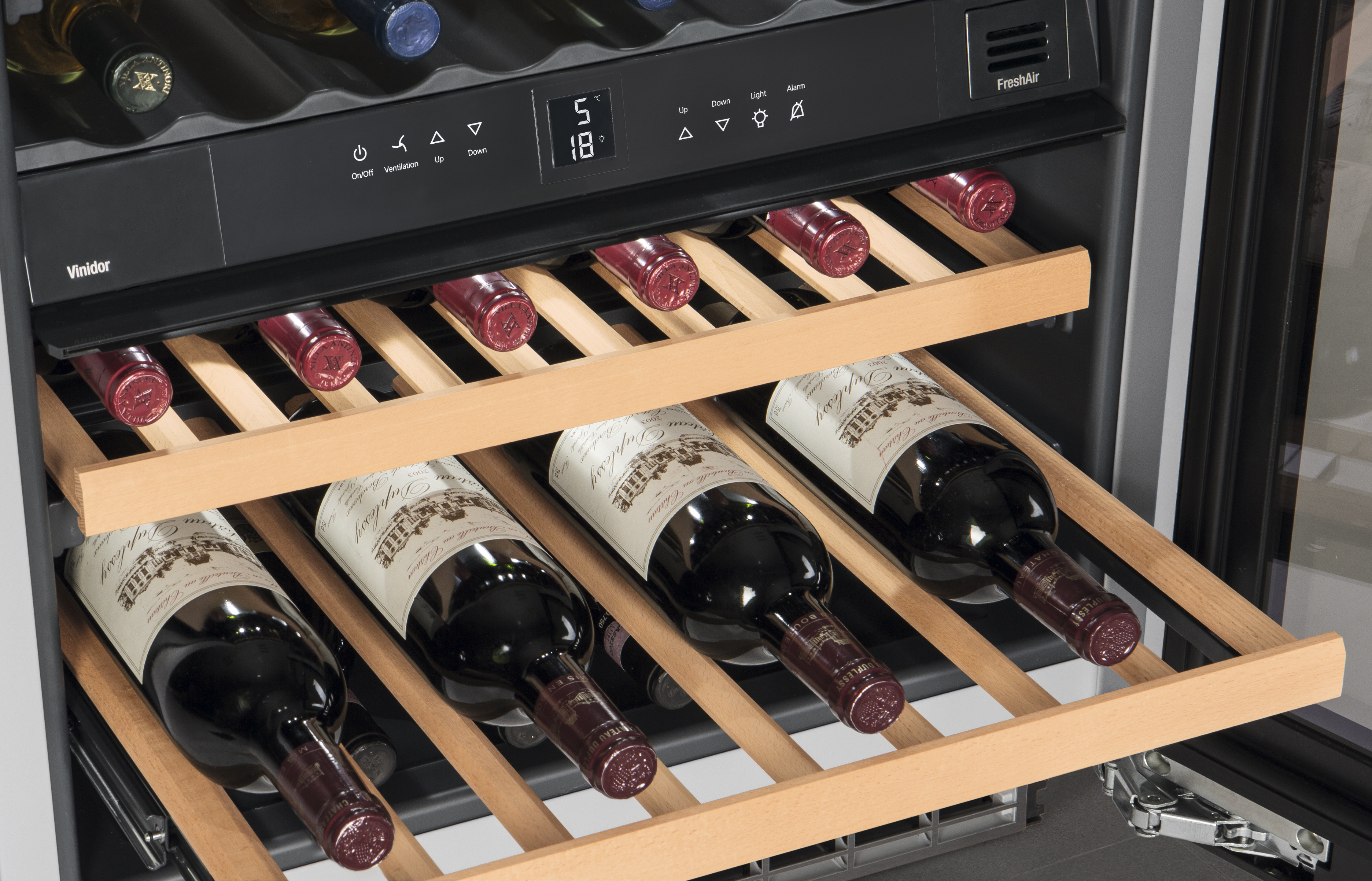 ● Trähyllor i obehandlad bok säkrar att det inte kommer in lukt in i vinet