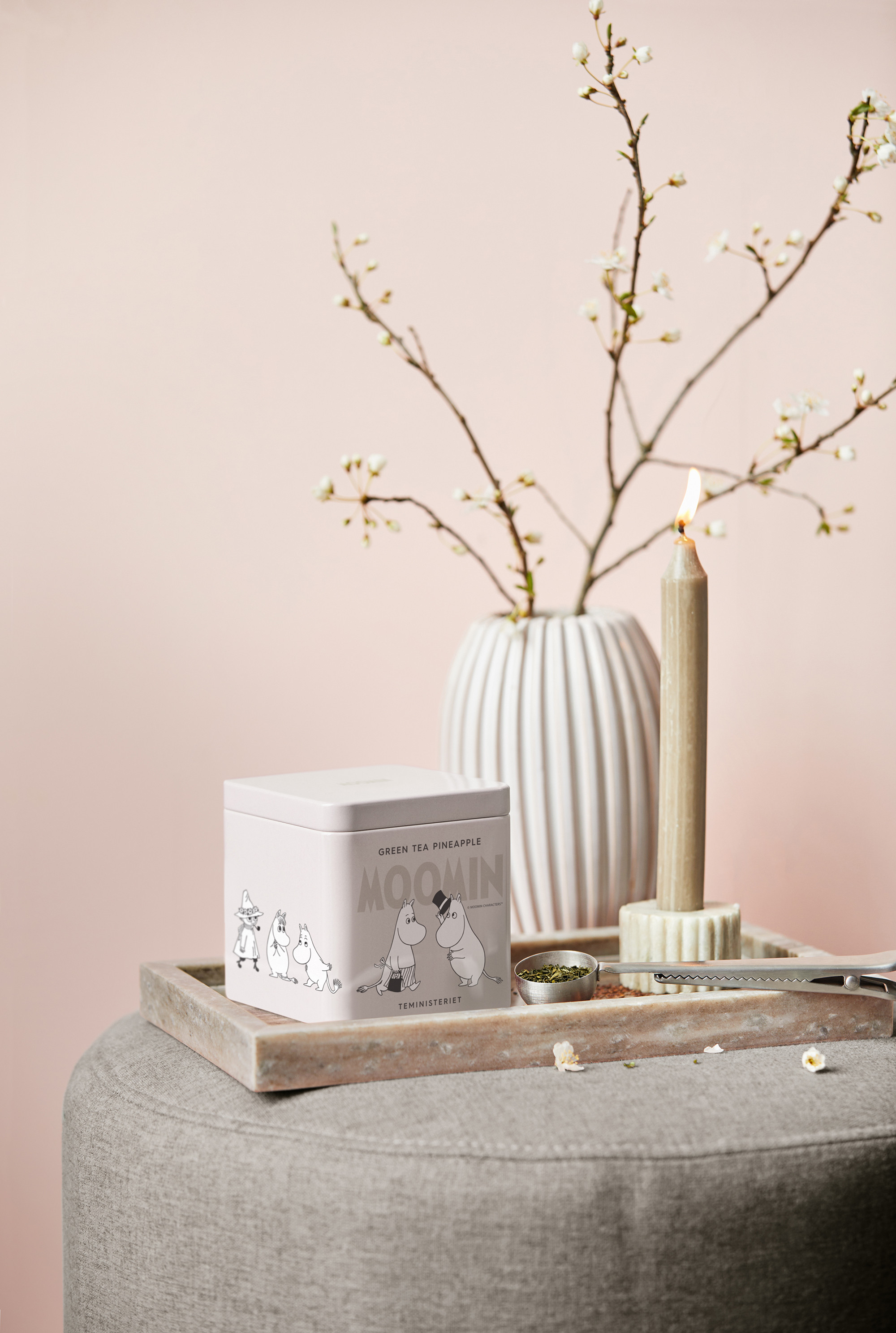 Den ena burken, MOOMIN GREEN TEA PINEAPPLE, är en alldeles speciell jubileumsburk med en cremefärgad neutral design som pryds av flera olika Moomin-figurer runt om burken. Denna exklusiva utgåva hyllar Moomins arv med ett stilrent och tidlöst uttryck, som känns igen med alla de söta mumintrollen som har fascinerat stora och små i imponerande 80 år.